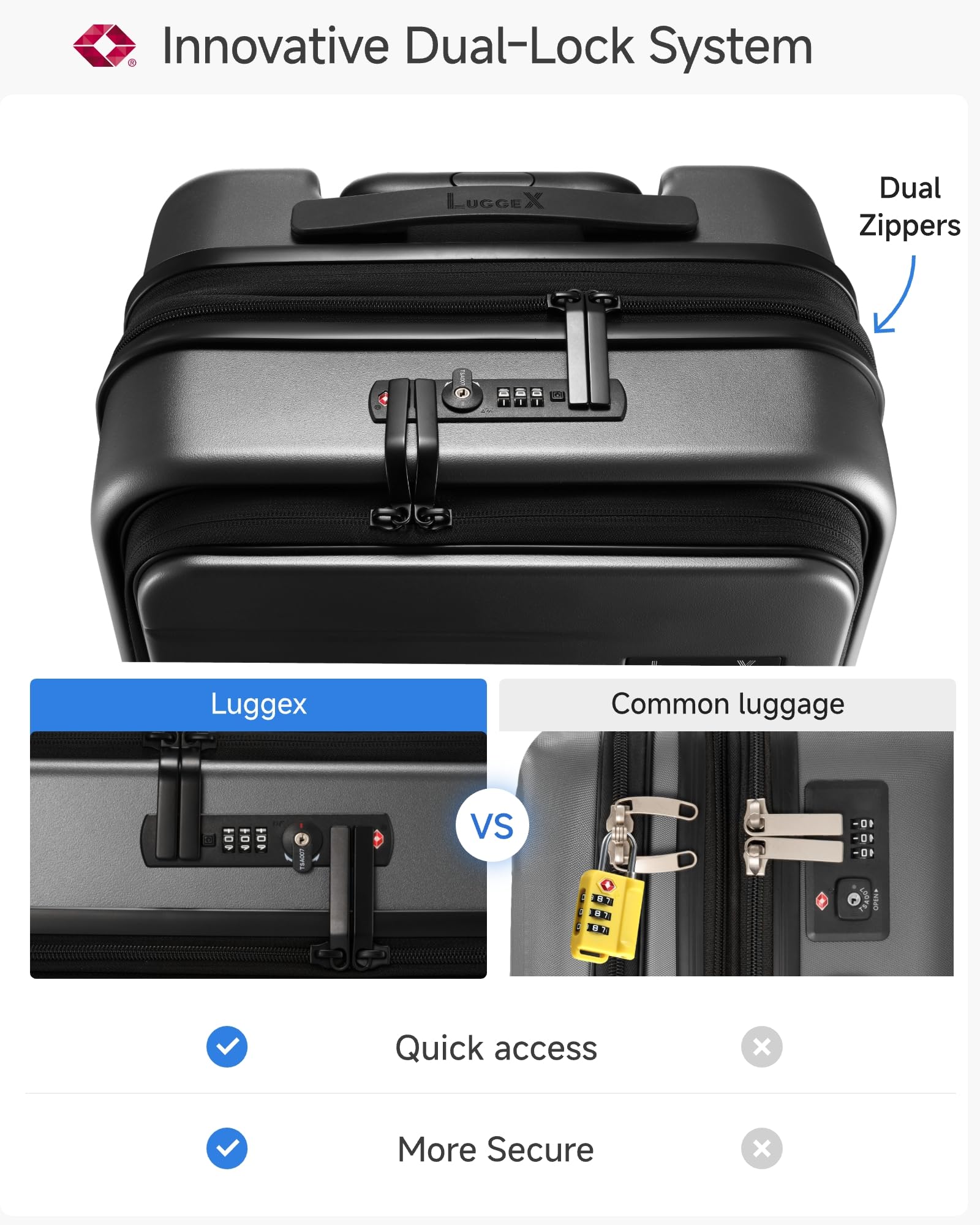 【All-in-One TSA Security】Crafted as premium travel luggage, it comes with a durable 100% polycarbonate hardshell and buttery-smooth 360° silent spinner wheels for effortless maneuvering. For enhanced peace of mind, we’ve introduced a TSA-approved dual-zone lock that securely locks both the front laptop compartment and main luggage area—an innovative design that sets LUGGEX apart in travel protection.