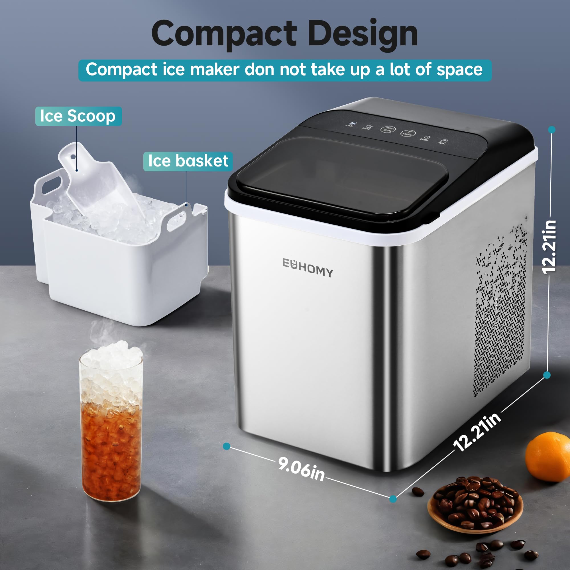 Smart Features and Auto-Cleaning Function: Unlike traditional ice maker machine, the EUHOMY portable pellet ice maker is equipped with an "ICE FULL" indicator to halt production and notify you when the basket is full. The "ADD WATER" alert ensures you never run out of water. With just a 3-second press of the "Ice/Clean" button, the sonic ice maker initiates a 5-minute self-cleaning cycle. The removable top cover allows for thorough cleaning, ensuring a hygienic ice-making experience.