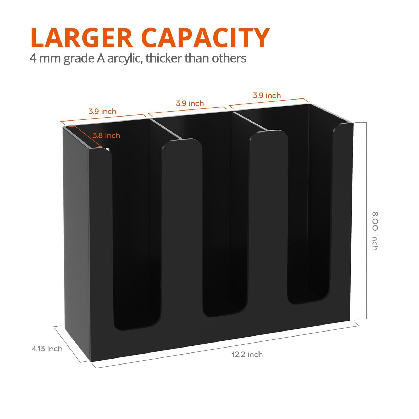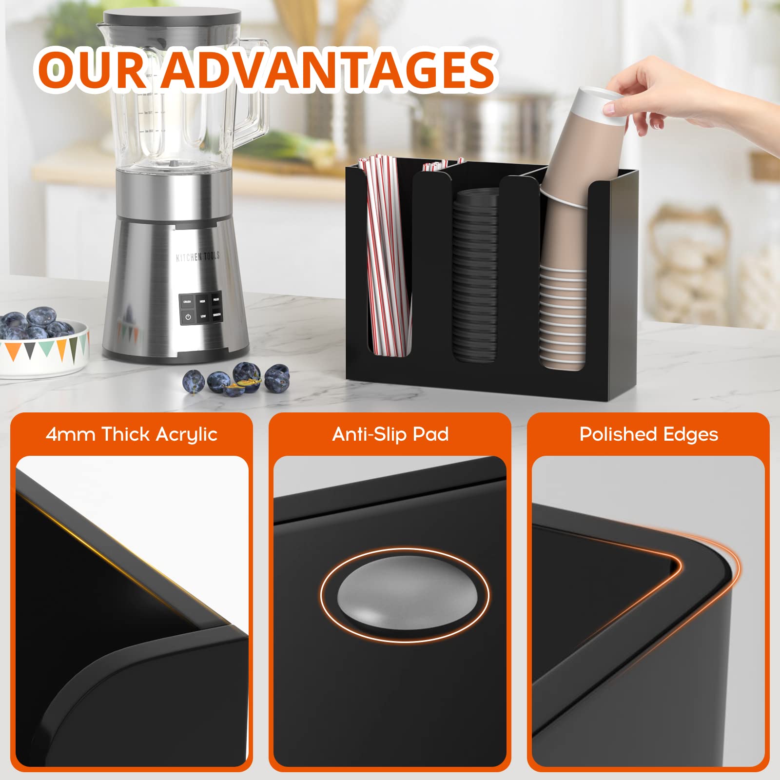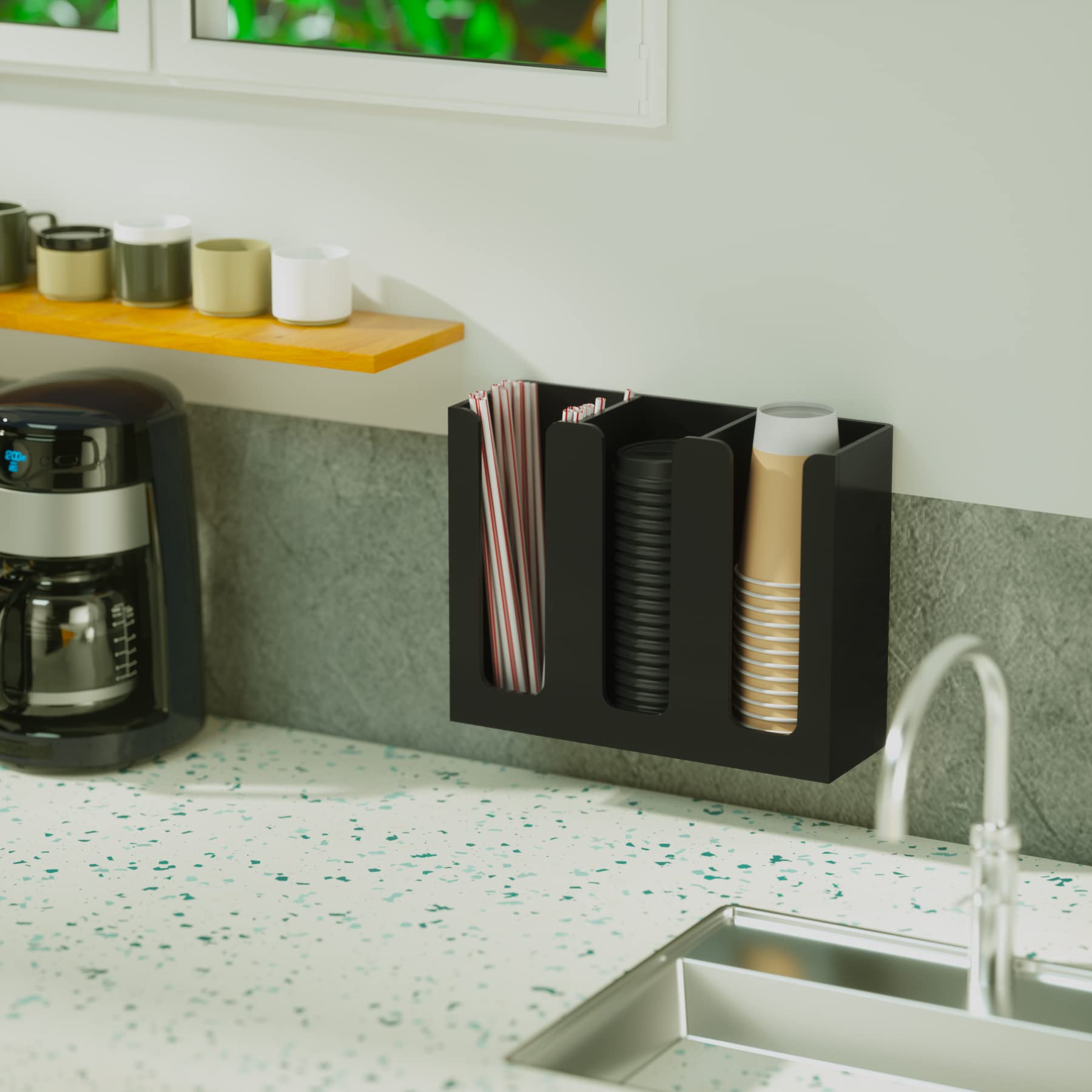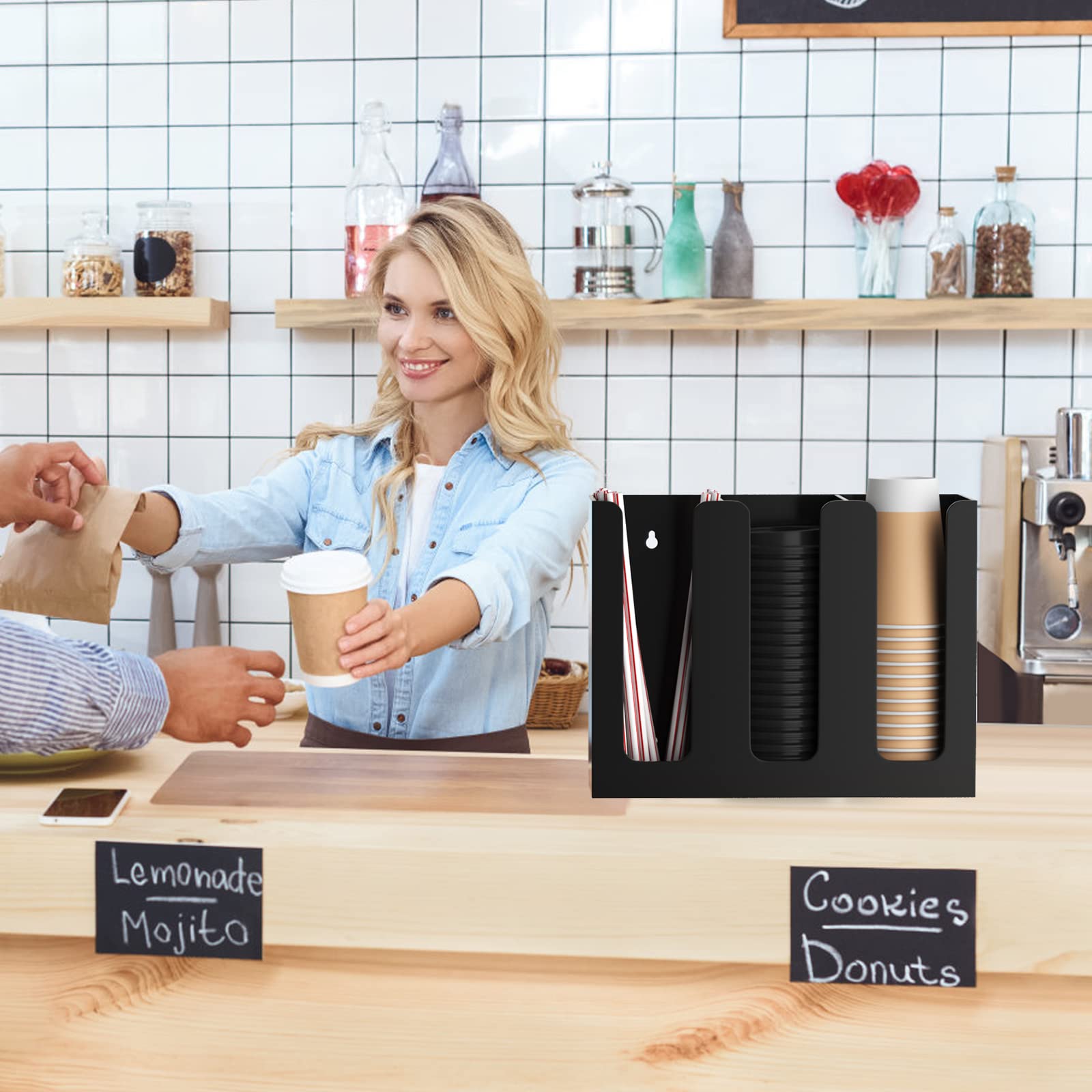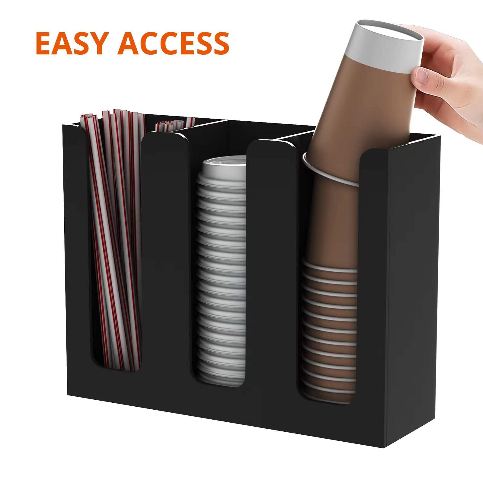 3 Section Design - the cup and lid organizer comes with 3 individual section, disposable cups and lids, coffee tea condiments can be storaged separately without any mess, it won't take much space of your countertop, making it look neater and more organized.