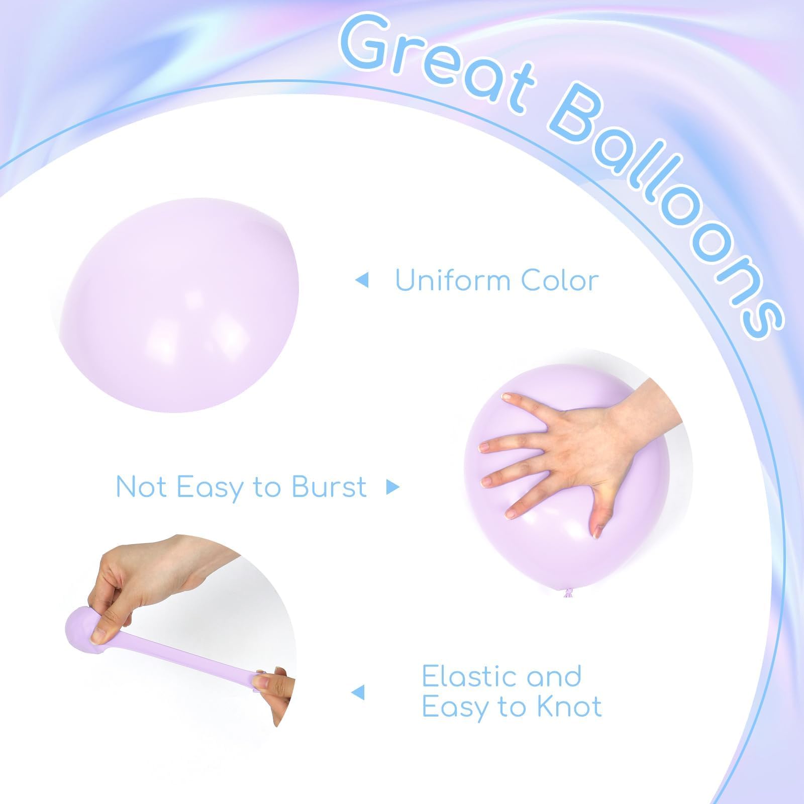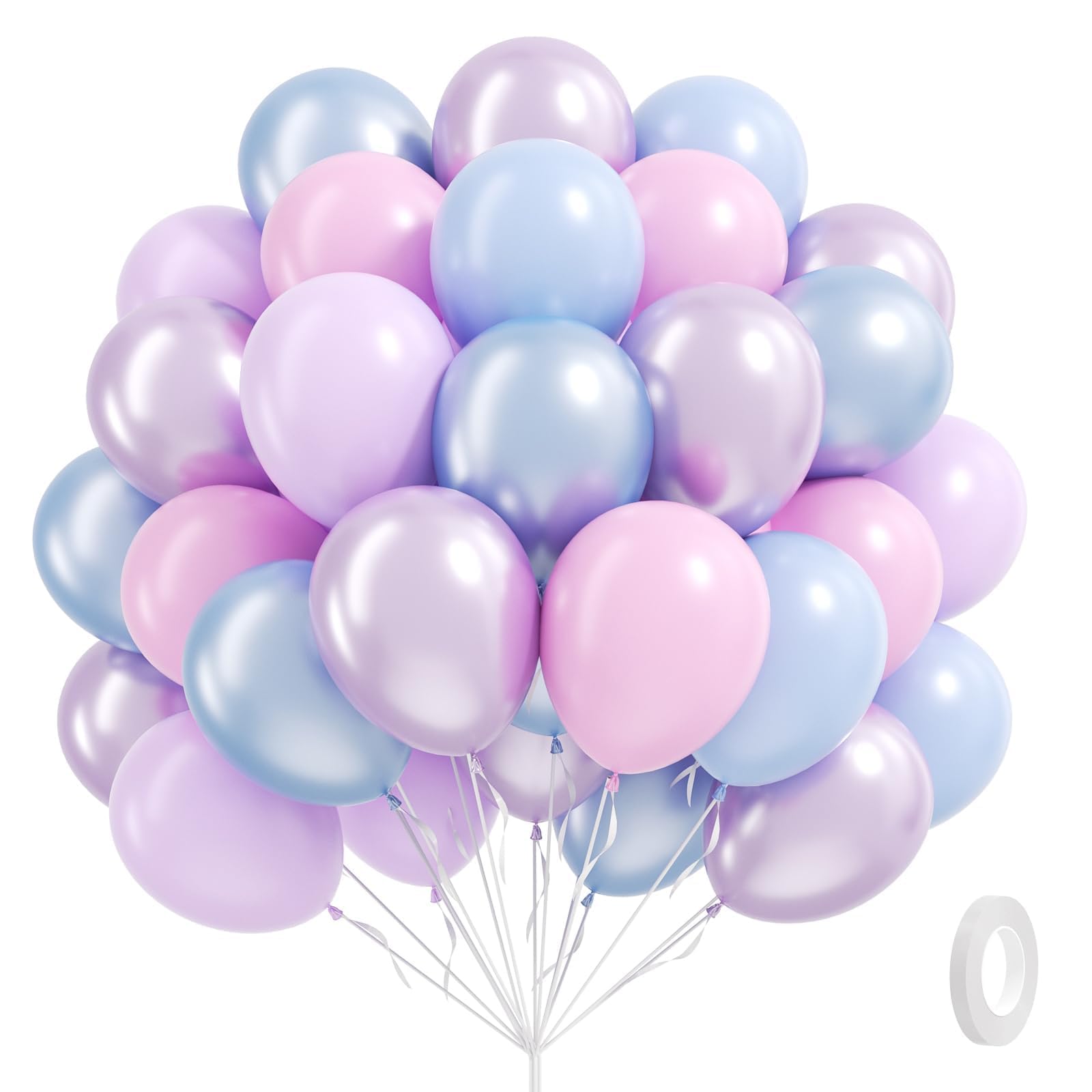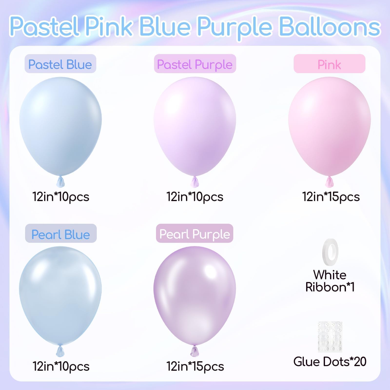 What You Will Get: The balloons includes 12inch pearl blue balloonsx10, 12inch pearl purple balloonsx15, 12inch pastel purple balloonsx10, 12inch pink balloonsx15, 12inch pastel blue balloonsx10, glue dotsx20, white ribbonx1