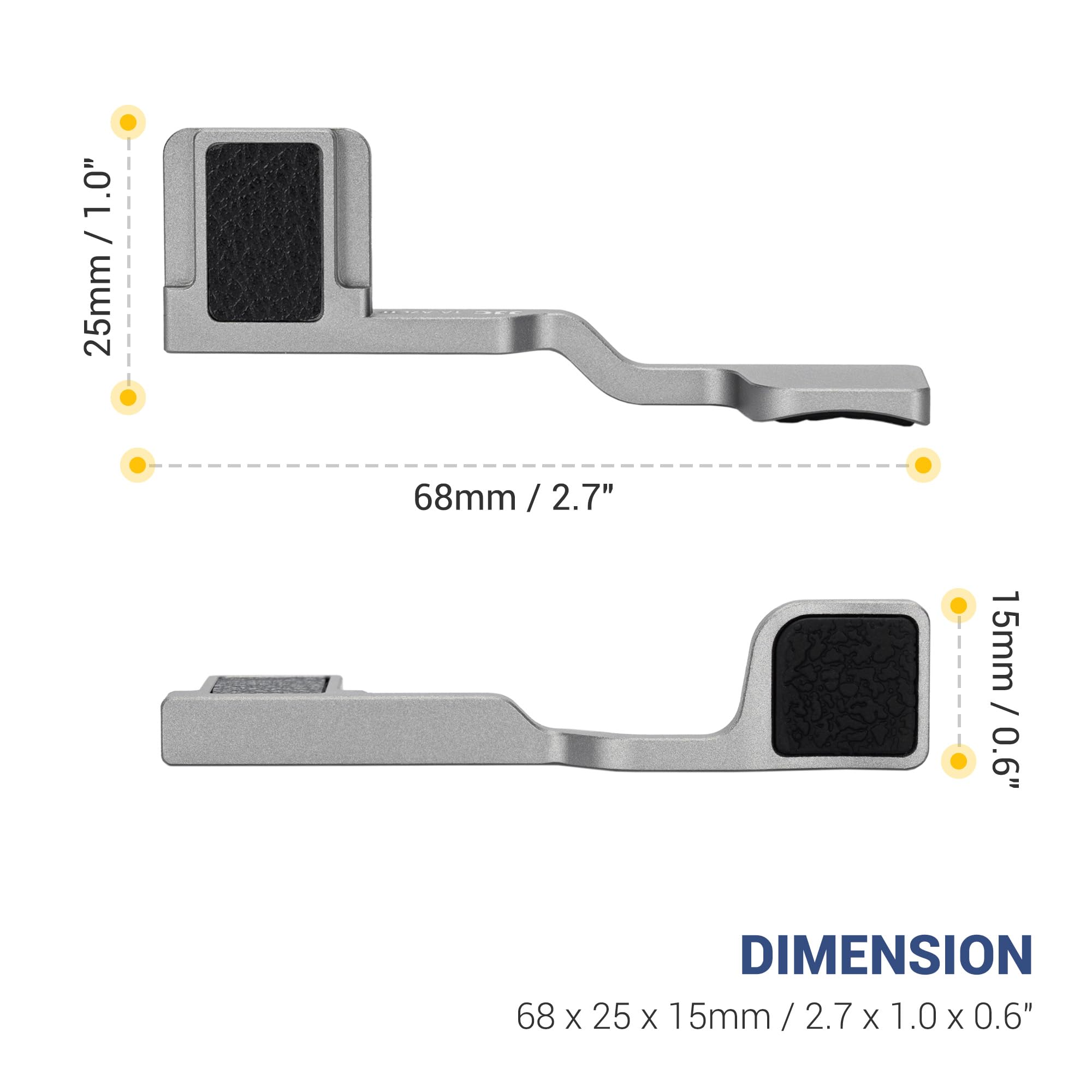 Made of aluminium alloy, it is sturdy and durable. The upgraded design of the microfibre leather top surface enhances the texture of the camera. The under-surface of the grip hot shoe part features a slim silicone pad that enhances a more stable snuggle fit into the hot shoe. And the silicone sleeve thumb grip area provides a more stable grip.