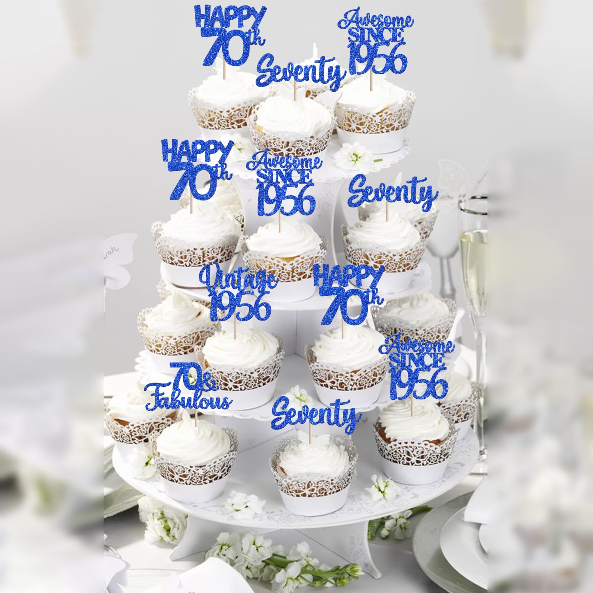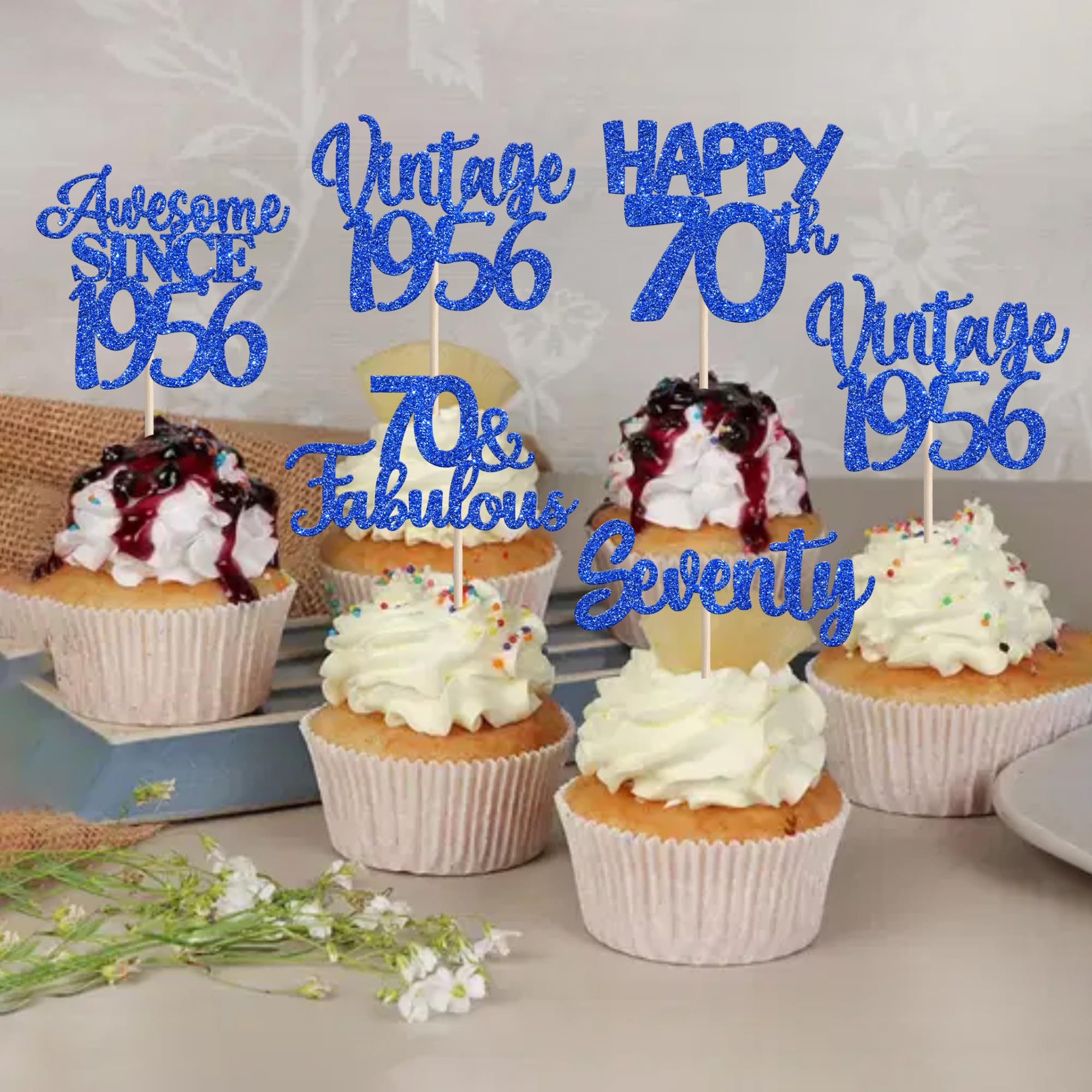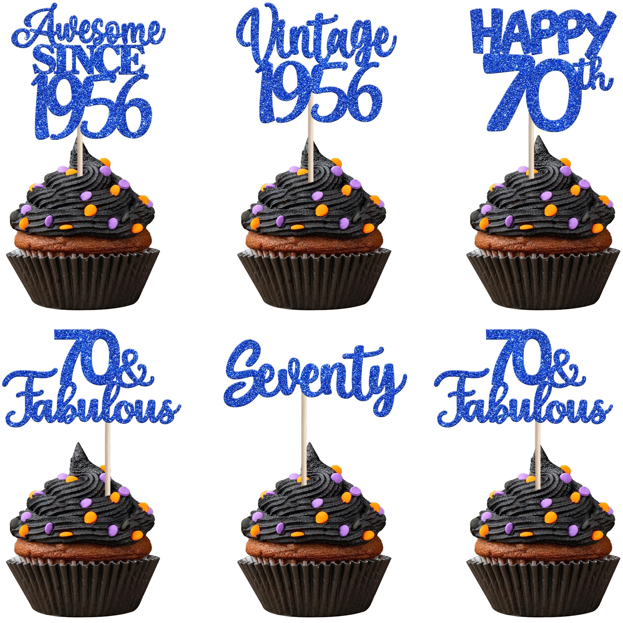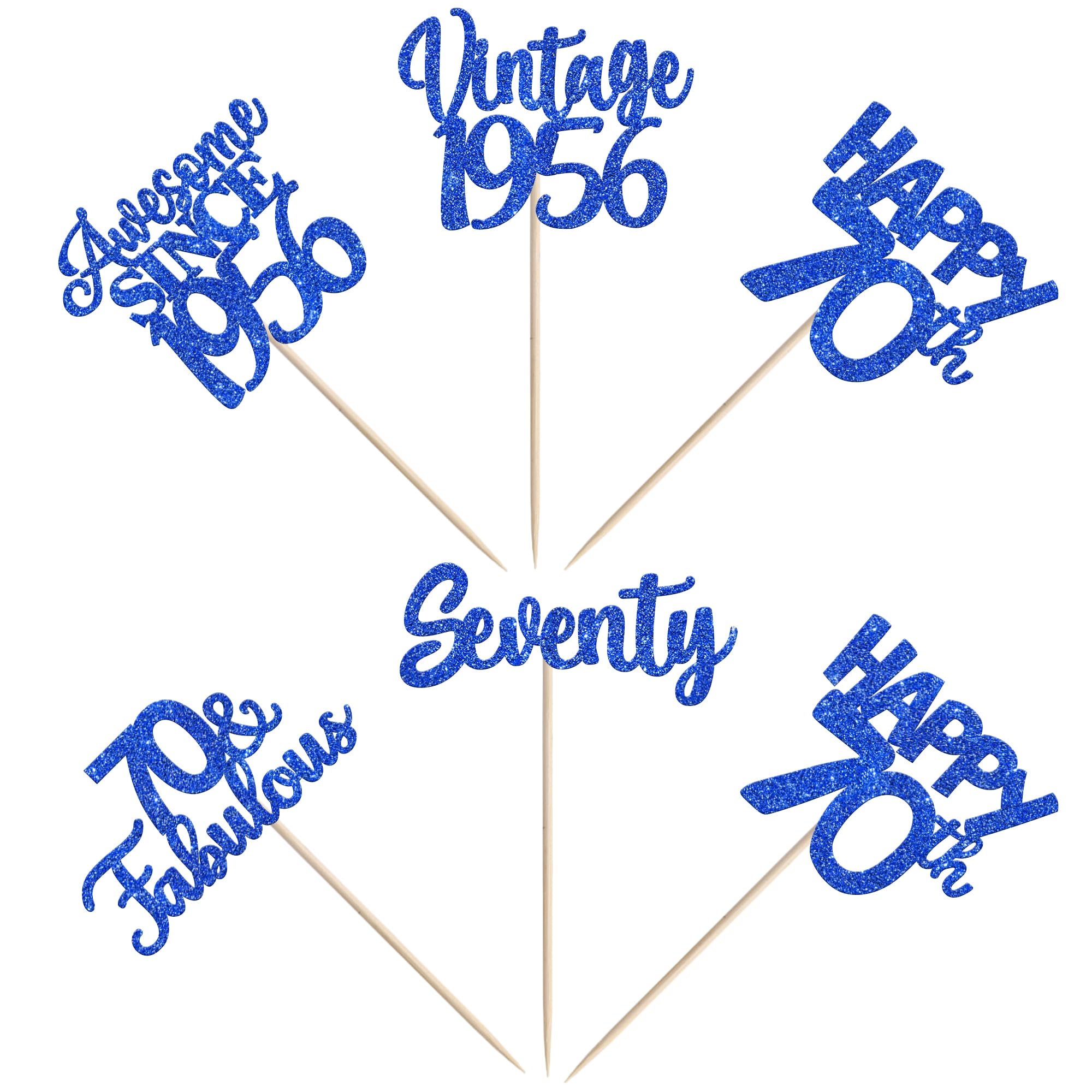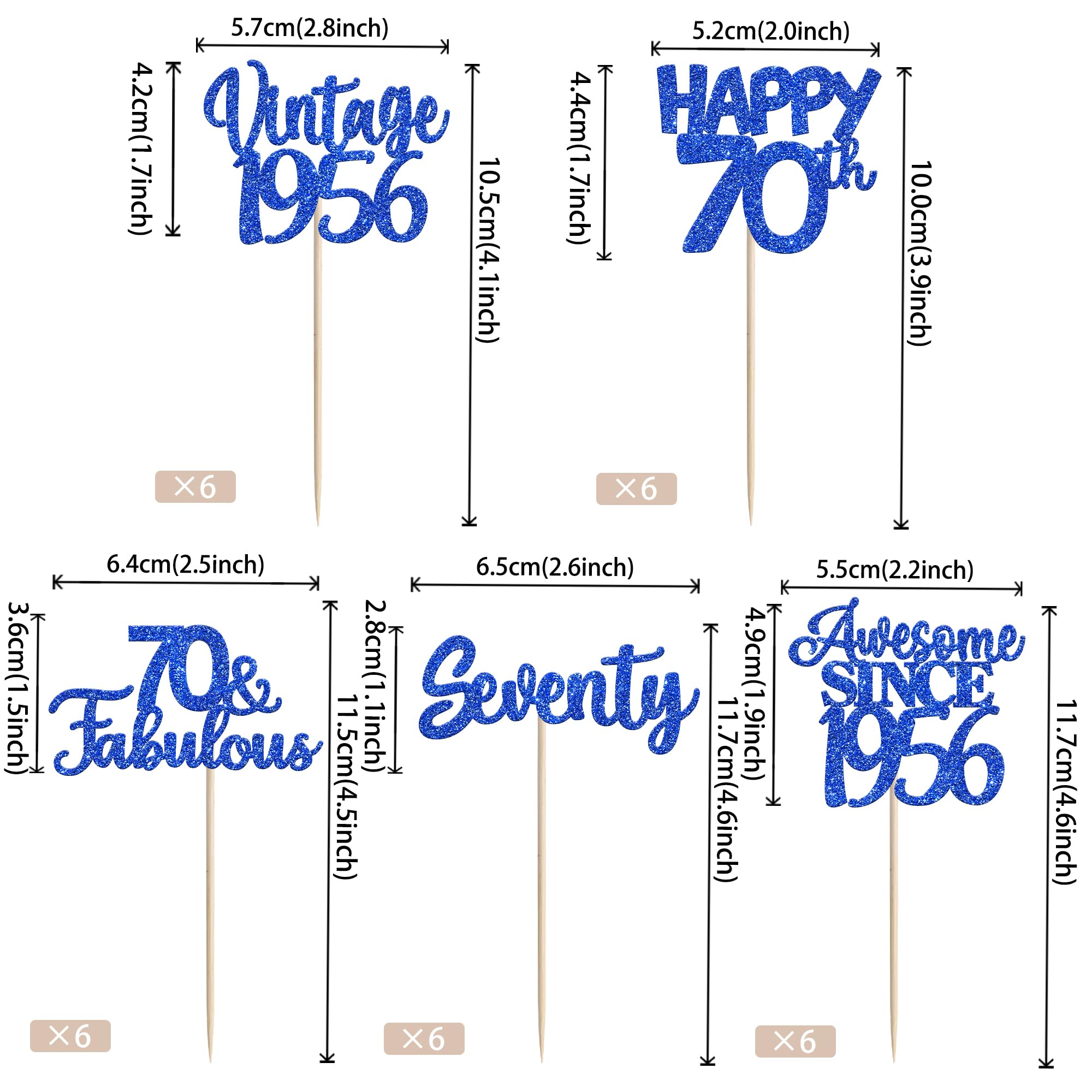 Vintage 1956 Theme 70th Birthday Party Cupcake Decorations Perfect for vintage 1956 theme party, 70th birthday theme party, 70th wedding anniversary theme party,cheers to 70 years theme party cupcake decorations supplies. Pack of 30 pcs,6 pcs of each design The size is 2.2*4.3/ 2.5*4.3/ 2*4.3/ 2.2*4.5/ 2.6*3.9 inch ( with stick ) Made of high quality paper card stock,thick and thick and sturdy. These vintage 1956 cupcake toppers are single glitter, the back is white, and they are intended for decoration only, please do not put them in oven or microwave. If the item you received has any defects, please contact us immediately.we will deal with it within 24 hours.