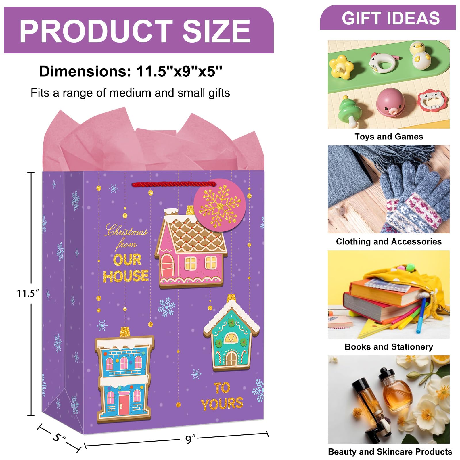 【Simplify Your Gift-Wrapping】: The Christmas gift bags come with handles, tissue paper, a gift tag, and a greeting card, making your holiday gift-wrapping quick and effortless.Each Christmas bag size 11.5"x9"x5",fits a range of medium and small gifts.