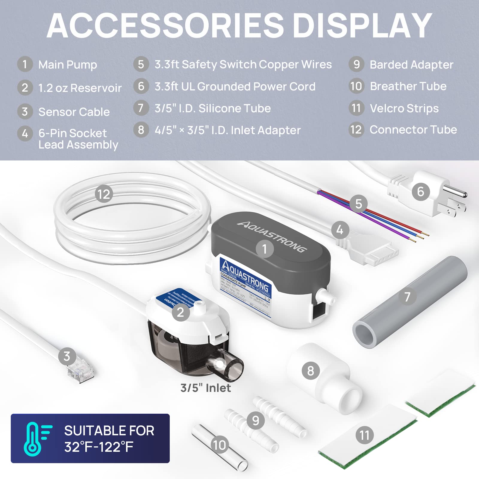 Easy Installation: Mini split design with anti-vibration velcro strips allows flexible installation in line set covers, wall cassettes, or above ceilings. Removable visible tank and filter for easy observation and timely cleaning. 3/5'' O.D. inlet comes with 3/5'' I.D. silicone tube & 4/5″ I.D. adapter. 3/10'' O.D. barded outlet fits vinyl tubing of 1/4″ to 3/8'' I.D.