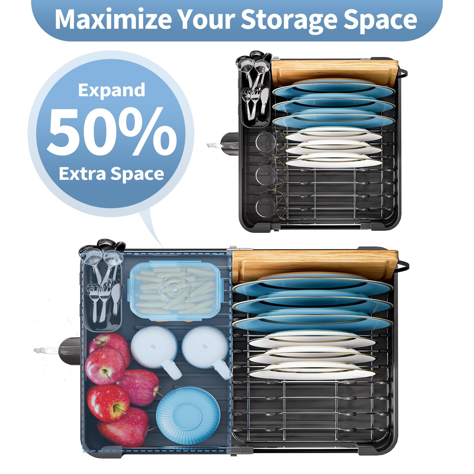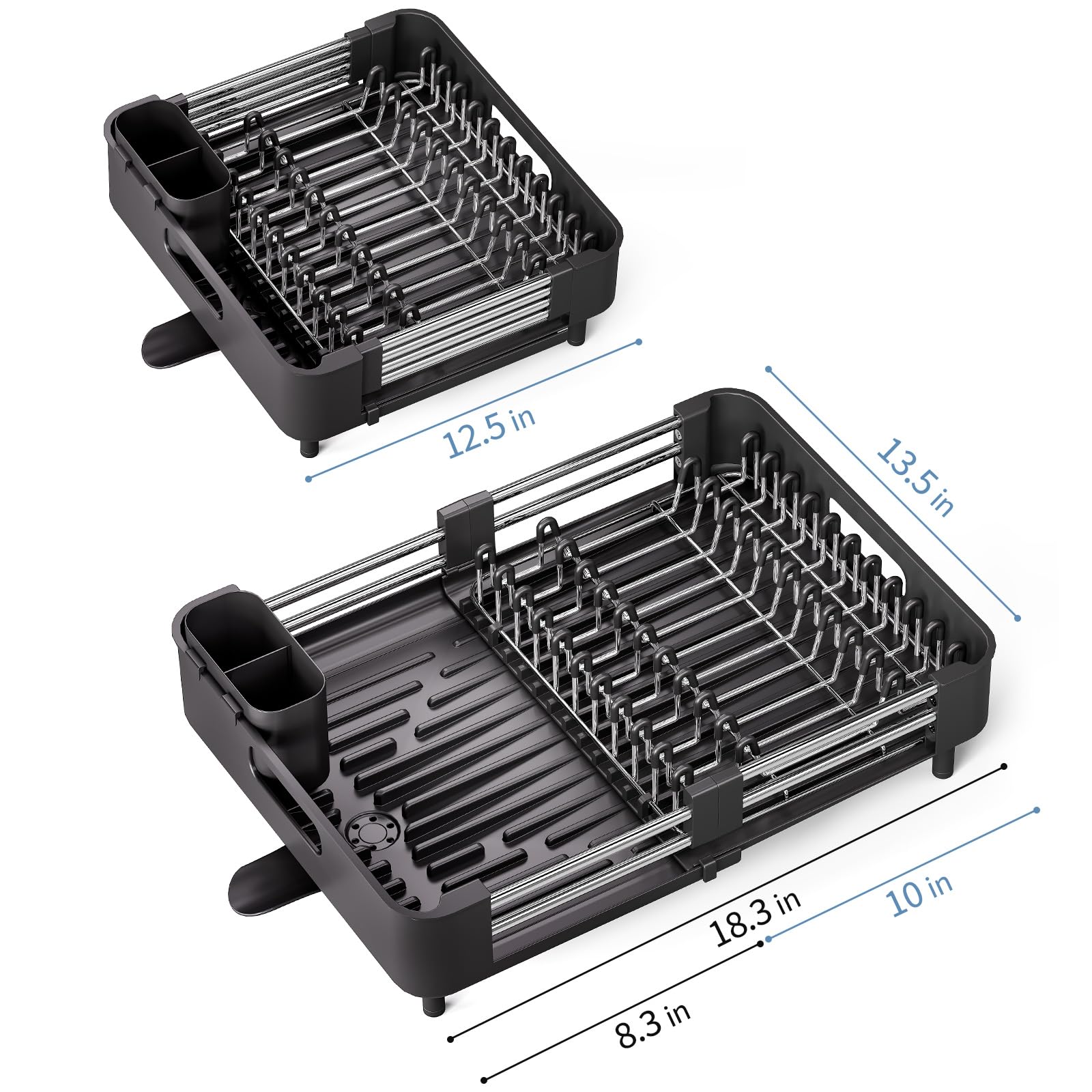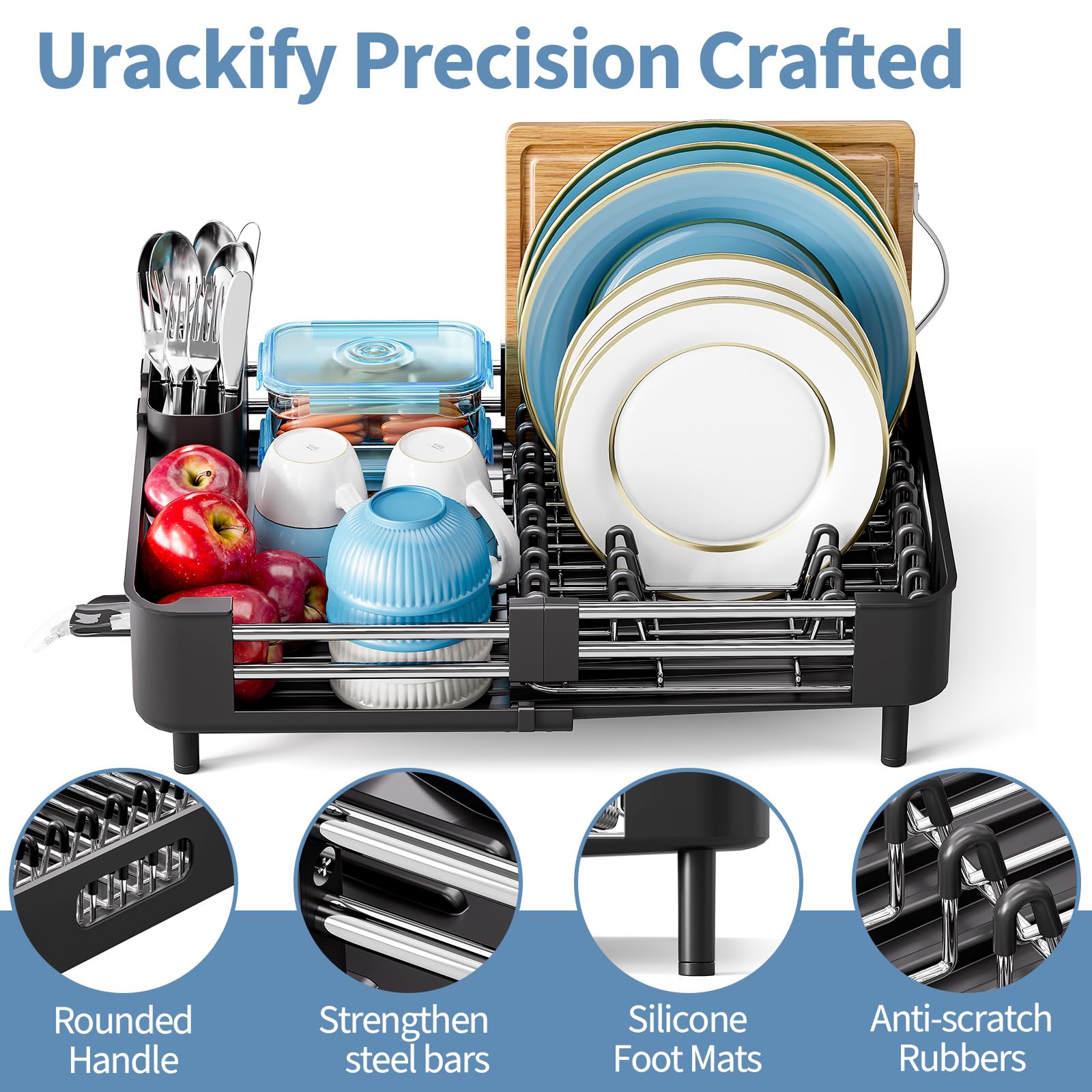 [ EXTENDABLE & FOLDABLE ] Urackify dish drying rack extends from a compact 12.5" to a full 18 inches in length, with a width of 13.9" and a height of 4.9". When fully extended, it provides ample space for plates, bowls, cups, glasses, mugs, and even full-sized pans and pots. Folded down, it's sleek and space-saving for easy countertop storage.