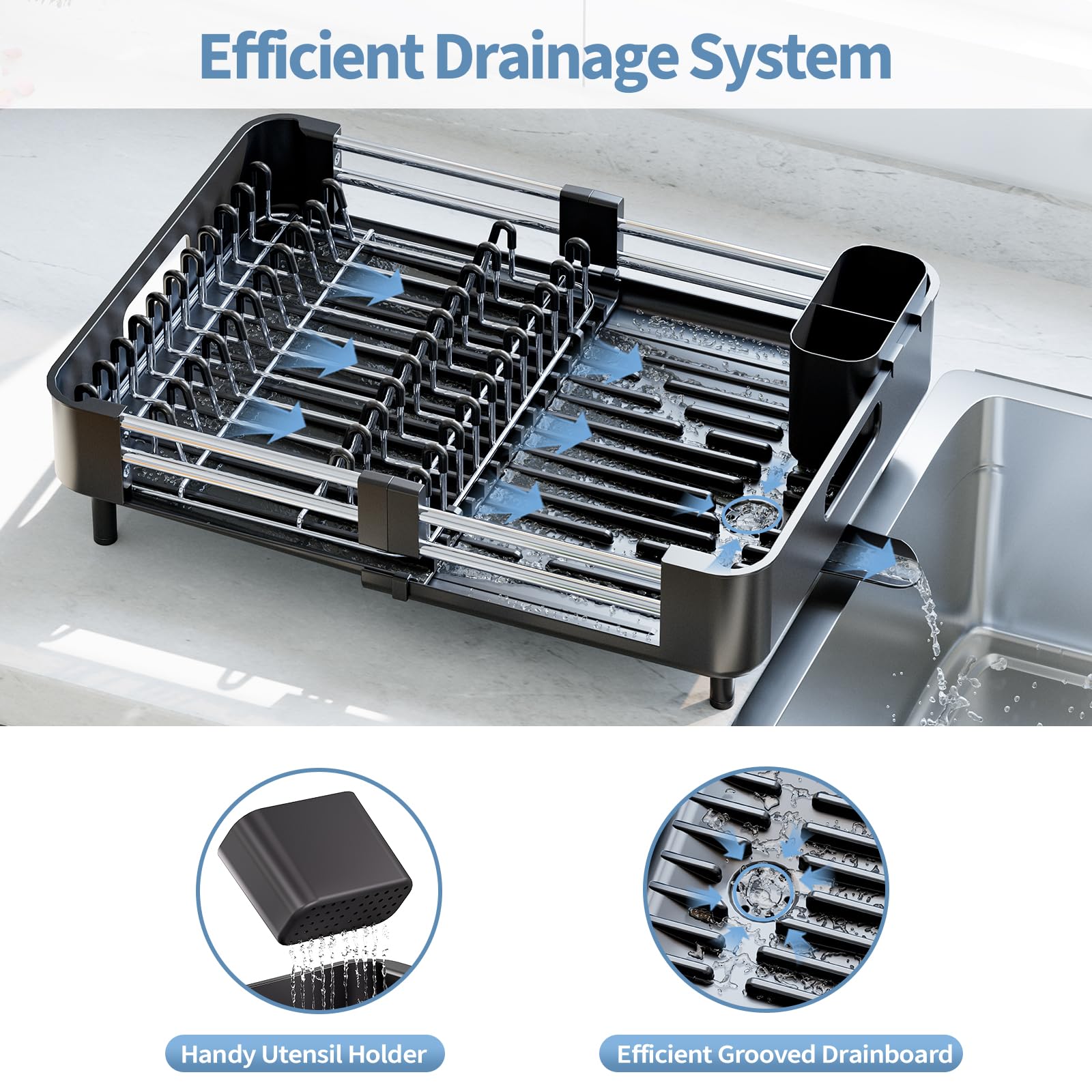 [ AUTOMATIC DRAINAGE SYSTEM ] Urackify expandable dish drainer holder comes with a fast-draining spout drainboard, together with innovative design for avoiding water accumulation and leakage, Your countertop storage will always be more convenient and tidy