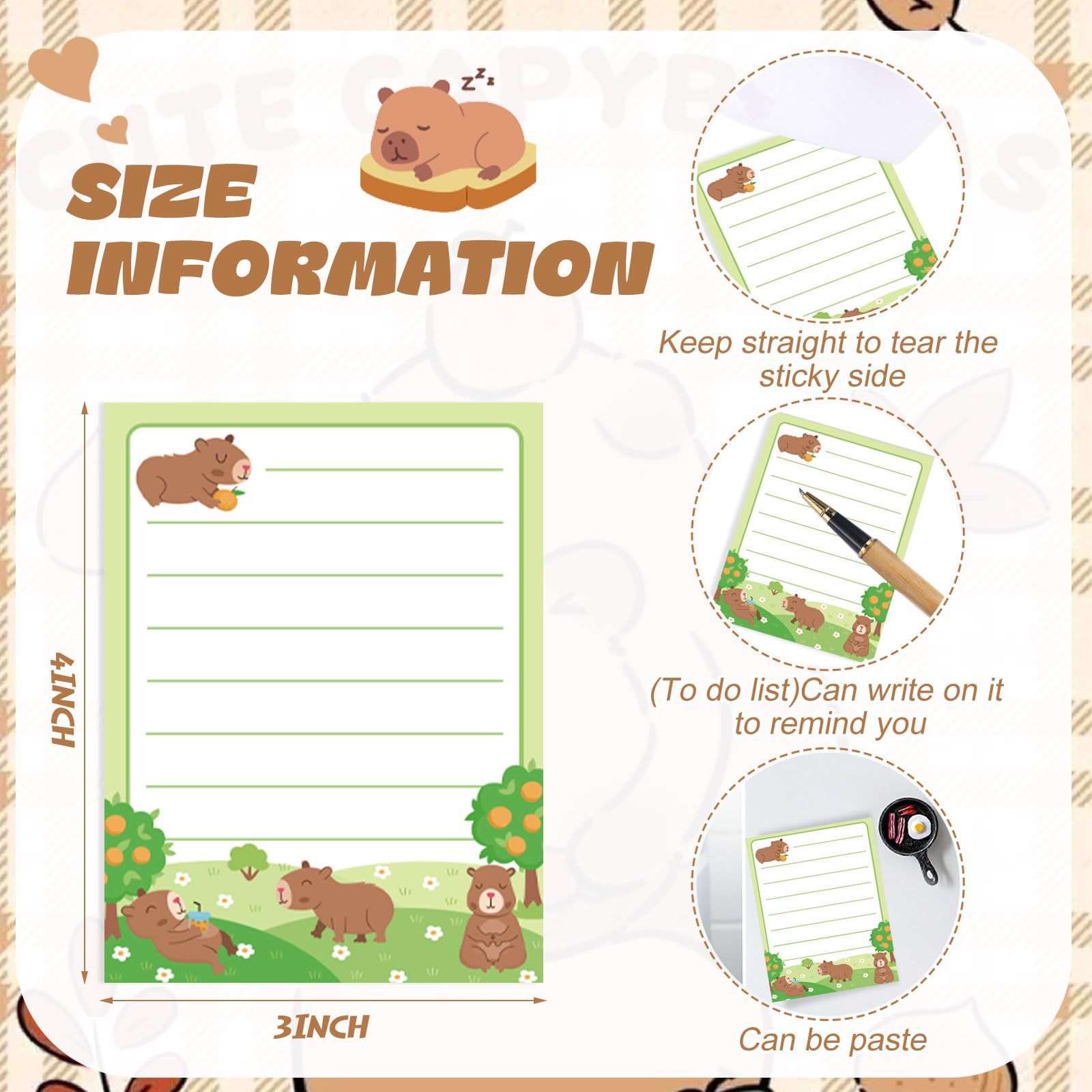 Adhesiveness and Detachability: with nice adhesion, these Capybara sticky notes can be easily pasted on smooth and dry surfaces, such as textbooks, notebooks, refrigerators, blackboards, walls, windows, doors, bulletin boards, etc., and can be easily removed without leaving stains