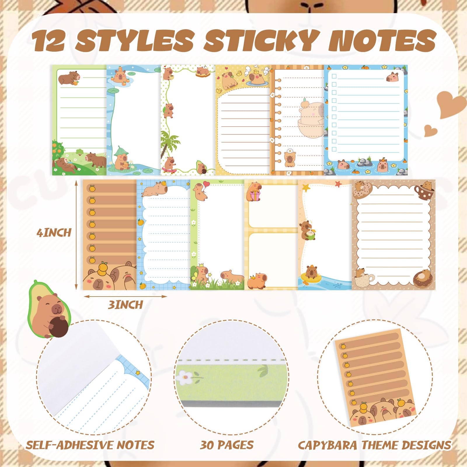Capybara Sticky Notes: you will receive 12 pieces of Capybara themed sticky notes, packaged with 30 pages each, for a total of 360 sheets; The dimensions are a handy 3x4 inches /7.6x10 cm, enough quantity and rich design to meet your various needs and replacements