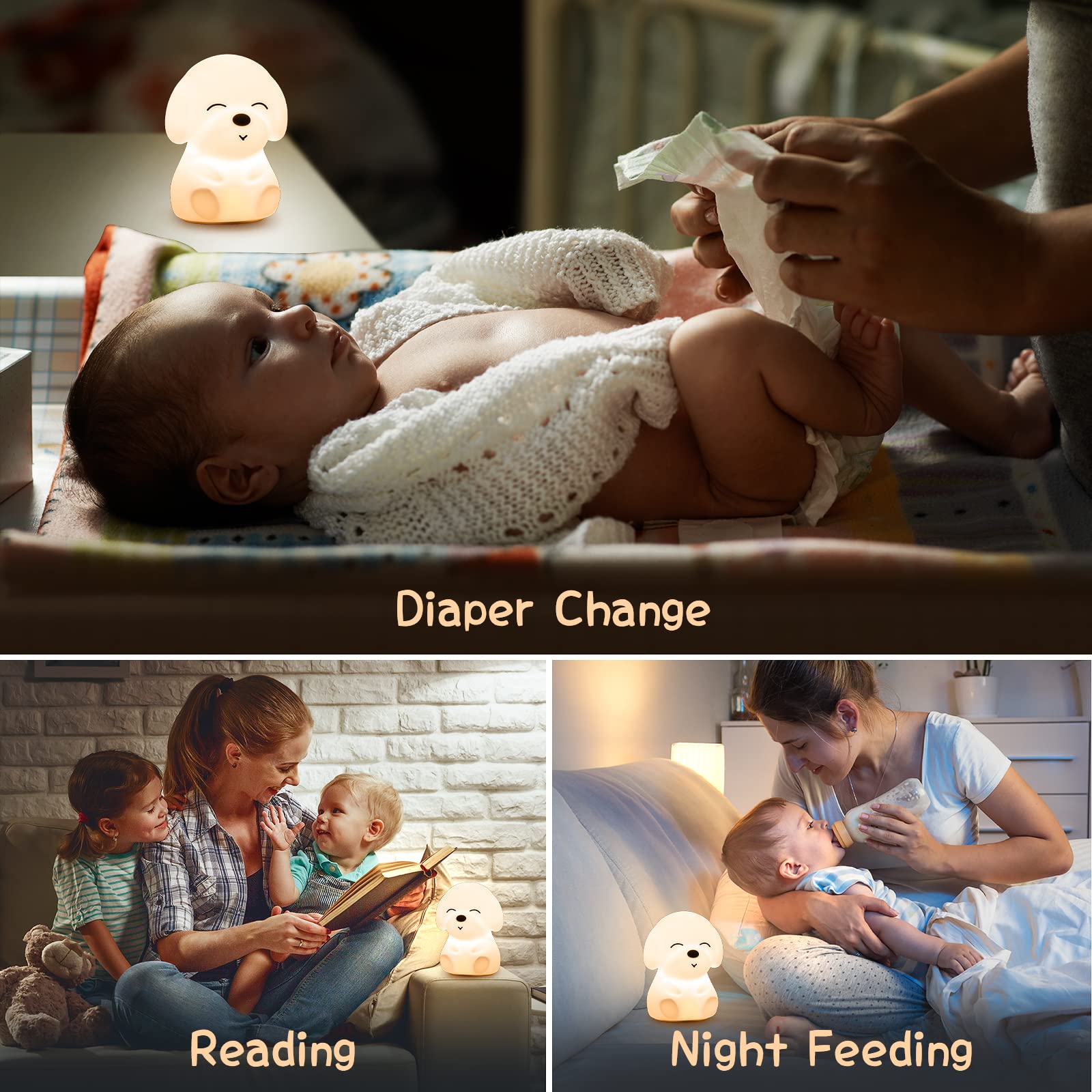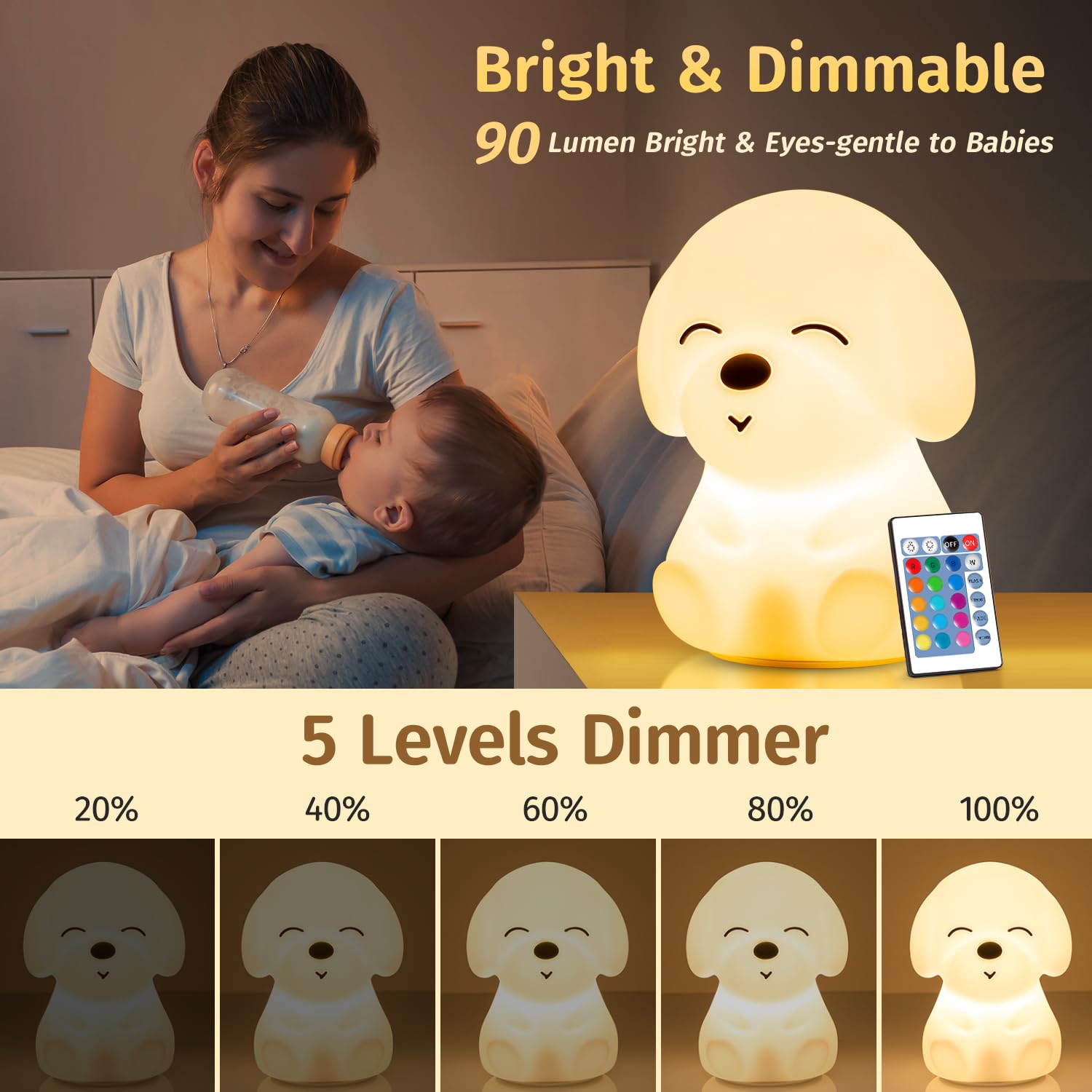 AUTO TIMER NIGHT LIGHT LAMP: This kids night light lamp is 60 lumen bright enough for mommy breast-feeding&baby nursing.The cute lamps for bedrooms also dimmable,mommy can dim night light down after baby's asleep.The cute night light for kids also has AUTO TIMER(30/60min)!Remote to control the kids night light-Dimming/Color Changing. U can control the nursery light without getting out of bed,don't worry about tripping over at night when getting up.The cute night lamp for bedroom is so baby caring that it's mommy's first choice!Just take this kids night light&night lamp for bedroom, the dog night light/kids night light/dim night light/battery operated night light cares for baby a whole night!