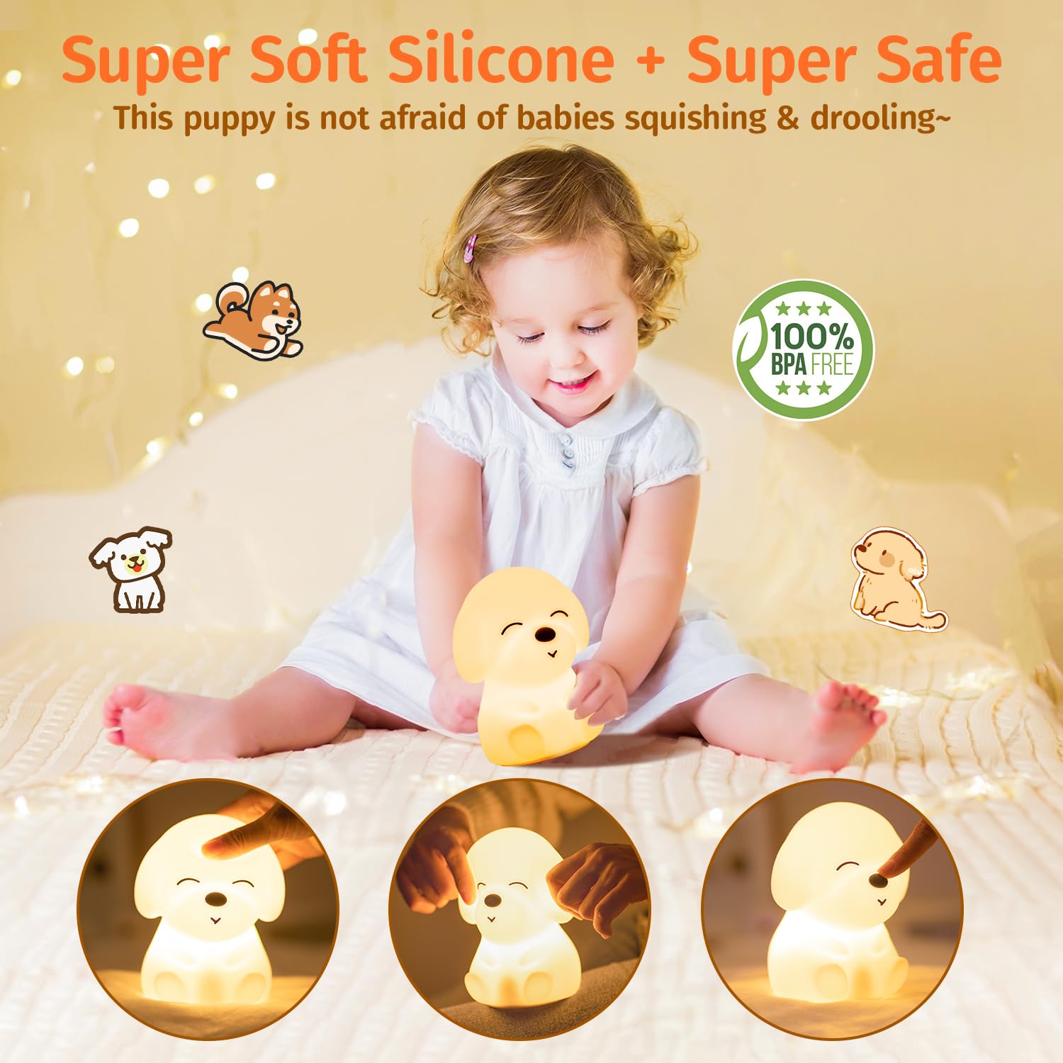 COOL & UNIQUE Gift Ideas for Kids/Baby: Dog lamp will accompany kids in dark night. And overcome the scare of darkness when kids 1-12 years old.The cute lamp, baby night light for kids toys is a fun touch night light.TAP! SQUISH! FUN!16 color-changing baby night light for kids night light for baby nursery lamp that can soothe baby's emotions,brings kids sweet and warm sleep every night.Kids love cute dog lamp,kids night light for baby nursery night light for kids for TAP FUN KIDS TOYS&as Christmas gifts!Just take cute night light for kids,toddler night light for baby nursery,kids lamp as kids room decor for boys toys,toddler night light touch night light squishy night light for baby nursery