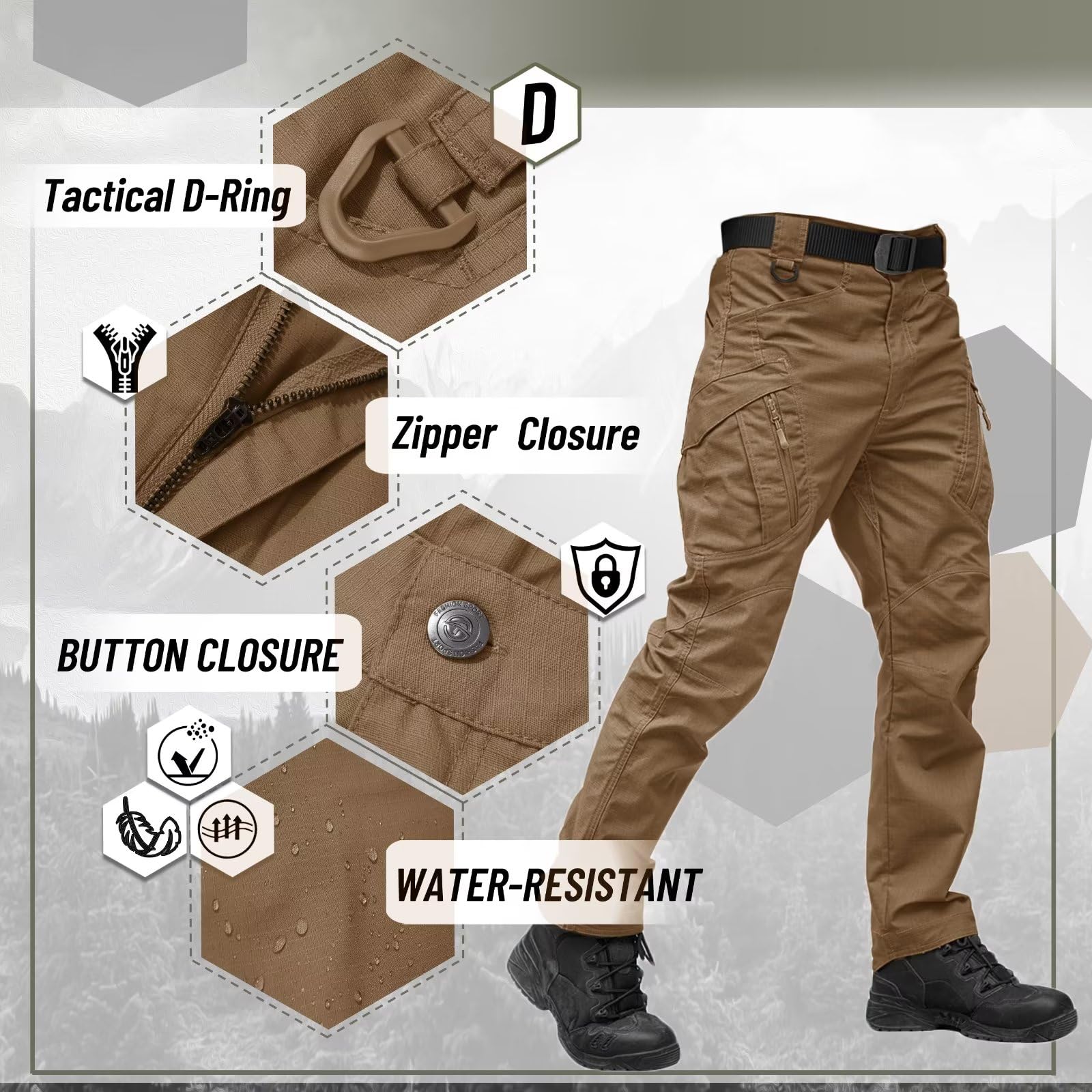 Tactical Design: Metal zipper with a button; self-adjusting comfortable waistband; knee joint and crotch design for athletic flexibility; widened belt loops to securely hold the belt; multifunctional D-ring; Slope type ankle strap; reinforced stress points.
