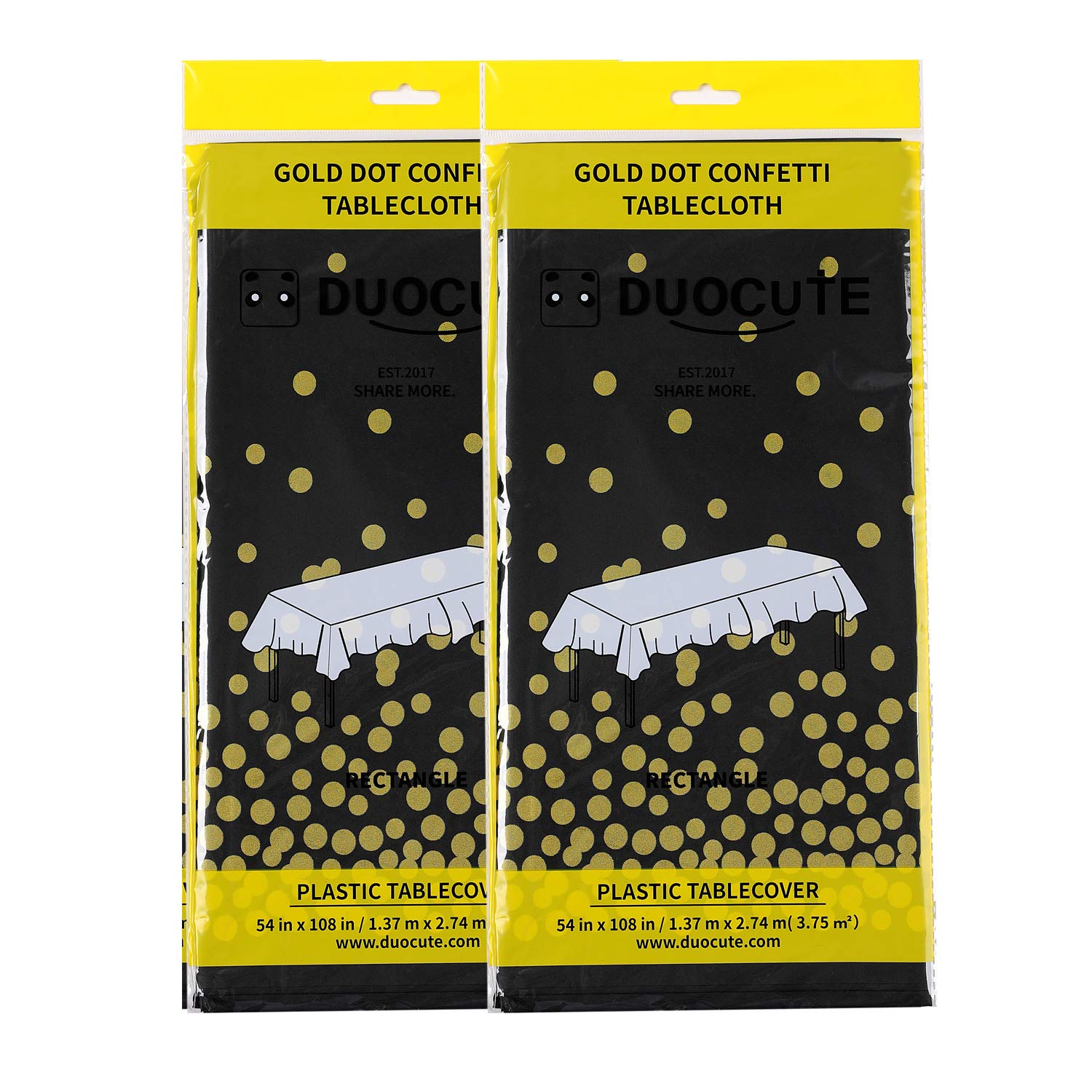 "The party tablecloth includes 5 different designs. Golden dot with Black, Golden dot with White, Golden dot with Blue, Golden dot with Pink, Rose gold dot with White. About DUOCUTE Duocute is committed to provide Premium Product for our millions of party lovers. Product Features : Size: Width x Length 54"" X 108"" / 137cm x 273cm Shape: Rectangle Material: Plastics PEVA Quantity: 2 Packs Ideal for Any Occasion: New year eve party, graduation and get-togethers, bachelorette parties, birthday parties, anniversary parties."
