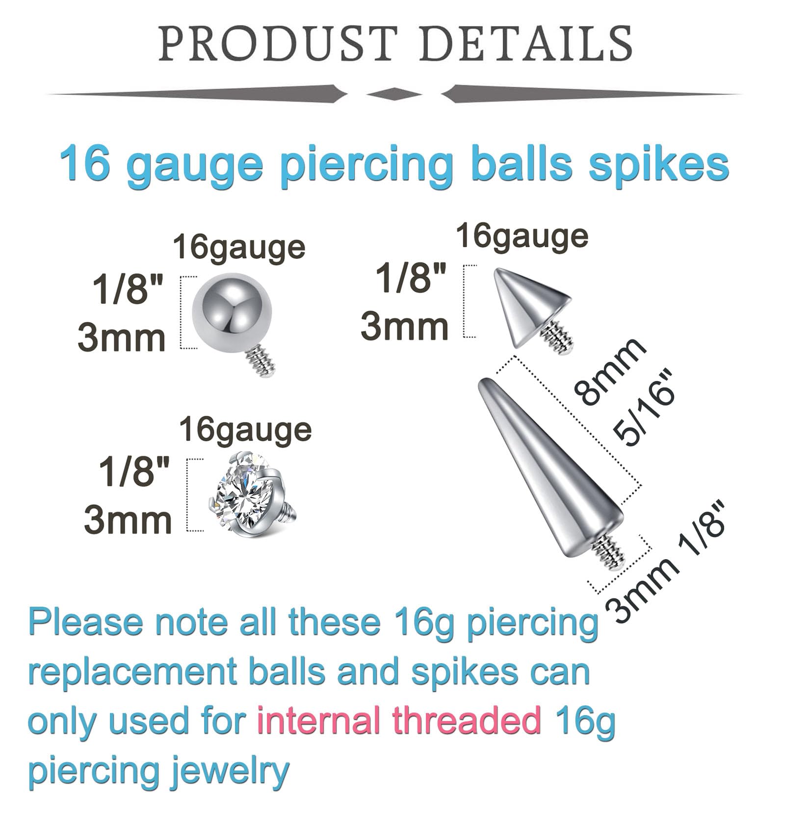 Package include - 4pcs internal thread 16 gauge balls for piercings (septum ring balls) + 4pcs internal threaded 16 gauge piercing zircon replacement + 4pcs internal threaded 3mm 16 gauge piercing spikes replacement + 4pcs 8mm internal threaded replacement long spikes for piercing (used for 16g lip studs labret stud snake bites piercing top balls replacement)