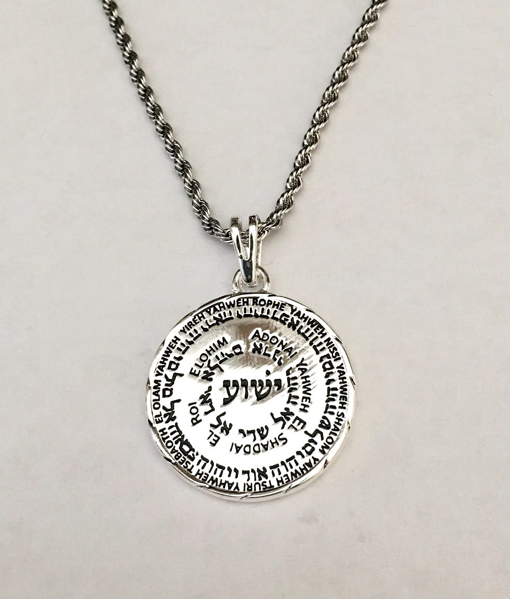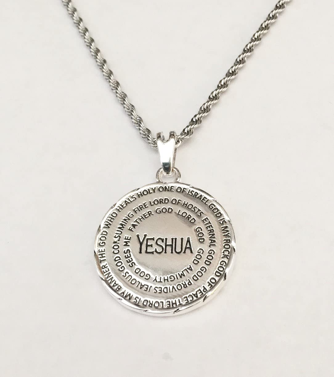 Description Yeshua Medallion Necklace – Names of God in English and in Hebrew – Silver plated medallion necklace with Stainless Steel Rope chain included Yeshua – Names of God in English and Hebrew. Front side has Yeshua in the center and the different names of God written around in a circle Back side has Yeshua in Hebrew and the Hebrew names of God listed around in a circle This is an exclusive new design