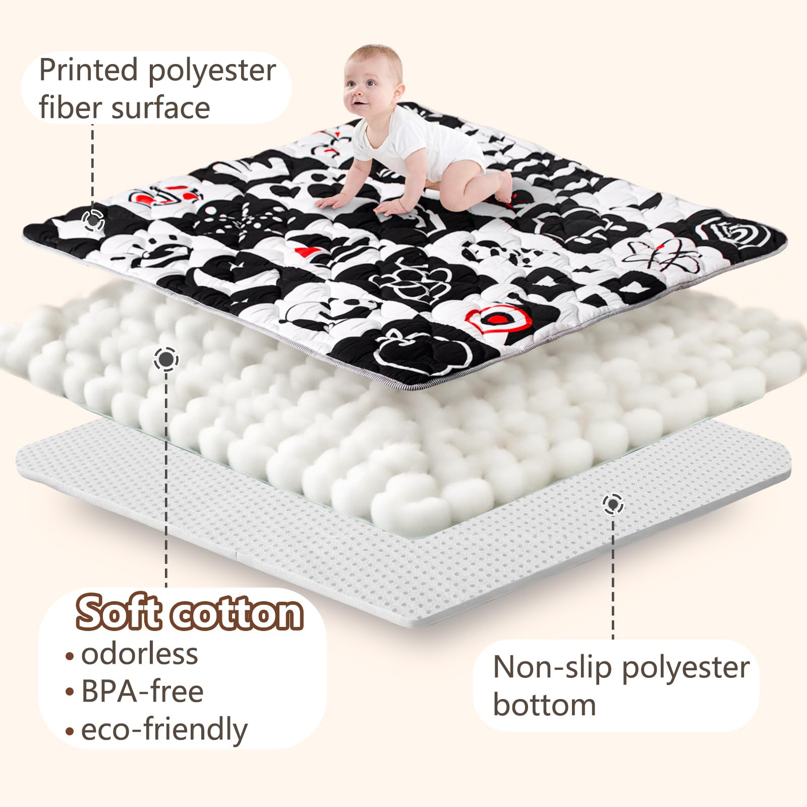 [Comfortable and Non-Slip]: The infant play mat is made of super soft fabric and is filled with 690g of microfiber per square meter, making it very soft and comfortable. The back side is covered with upgraded non-slip silicone dots that has an excellent grip. Provides pure comfort for baby crawling, rolling and playing