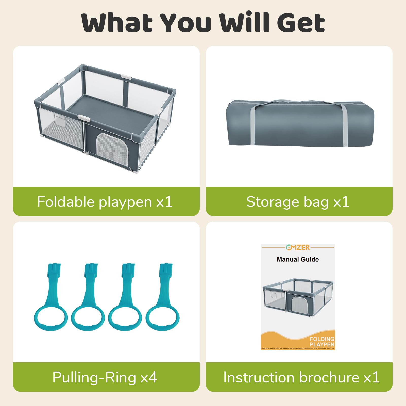 【Foldable Baby Playpen】 OMZER Foldable Baby Playpen engineered with collapsible baby playpen technology, the baby playpen comes with 4 pull tabs and storage bag. It can be set up and taken down in just 60 seconds, and perfect muted grey color for any decor, great for space and decor conscious parents. Assembly time is reduced by 70% compared to traditional baby playpen.