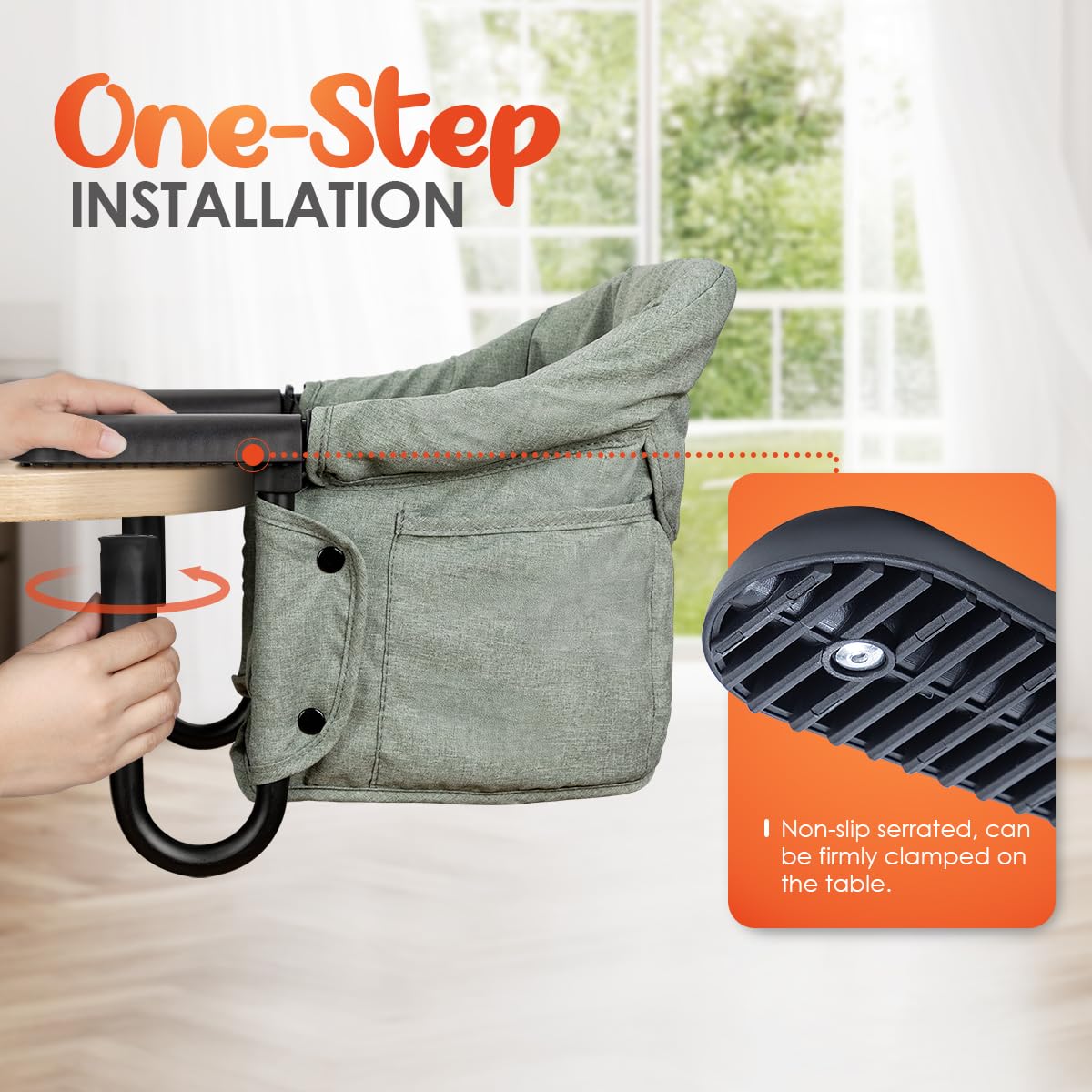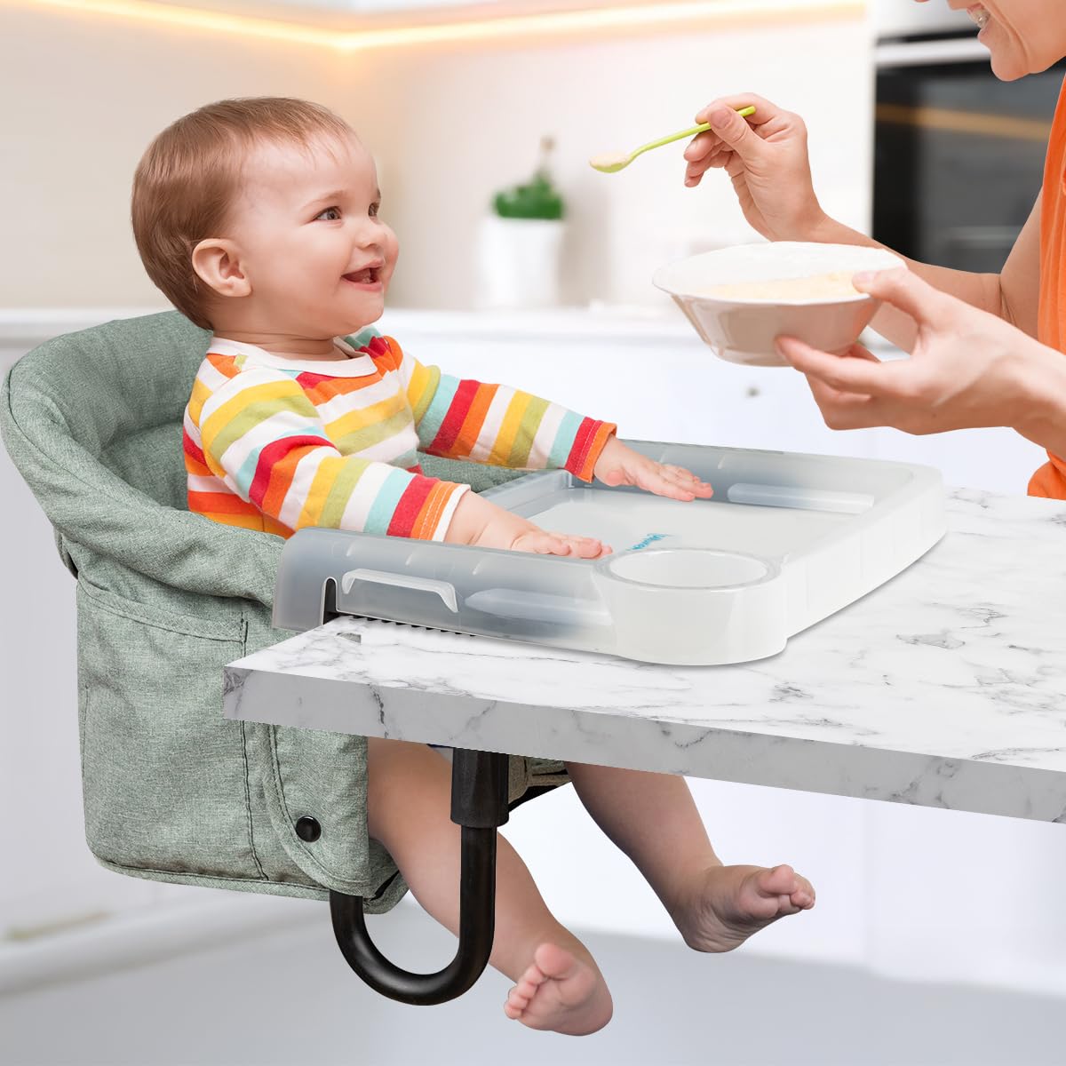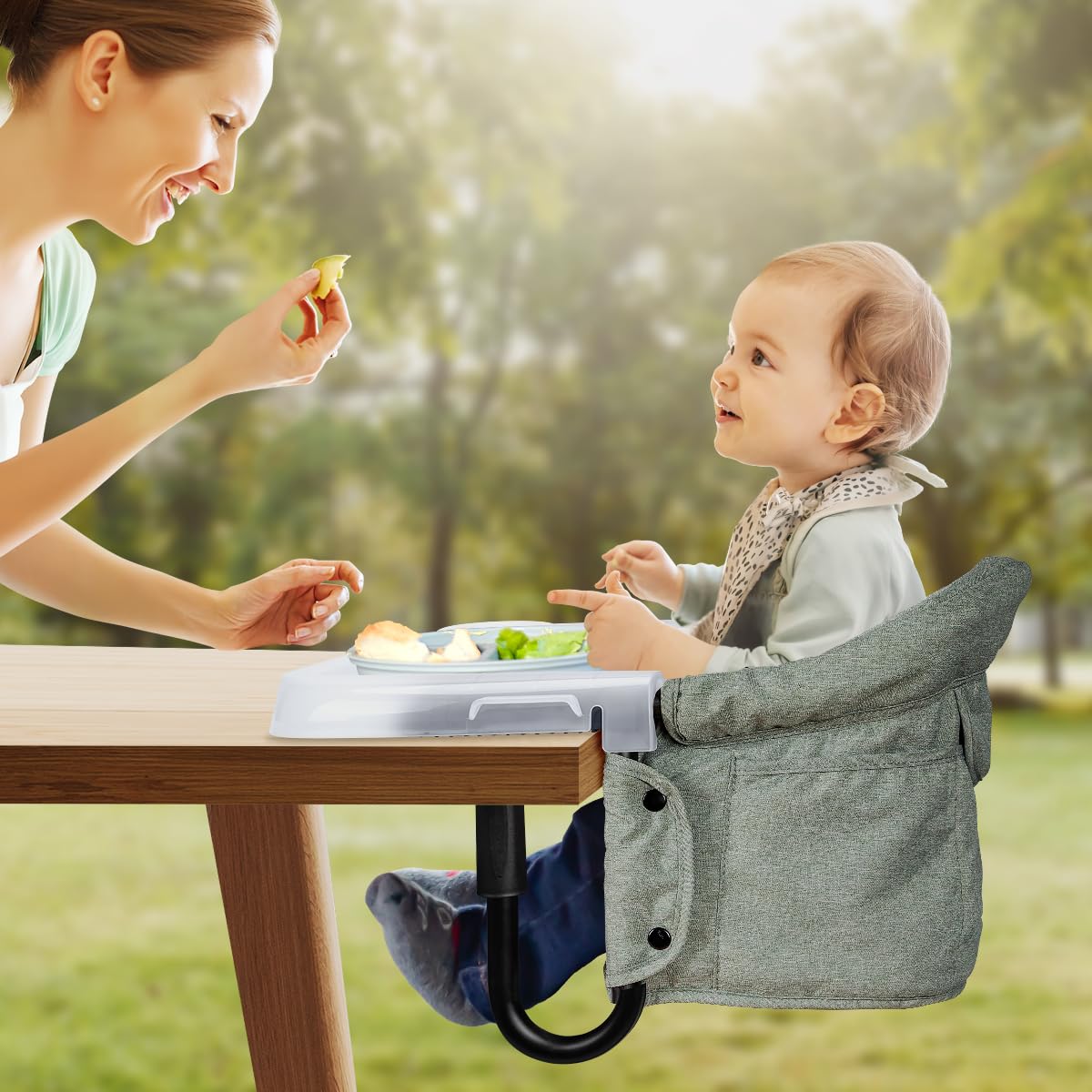 【Portable Hook-On Chairs with Tray】Our portable hook-on chairs is designed to be compatible with most types of tables ranging from 0.8 inches to 3.3 inches (20-85mm) in thickness,ensuring a secure fit on a wide variety of tabletop surfaces.It comes equipped with a convenient detachable feeding tray that attaches and detaches with ease,making mealtime a breeze for parents