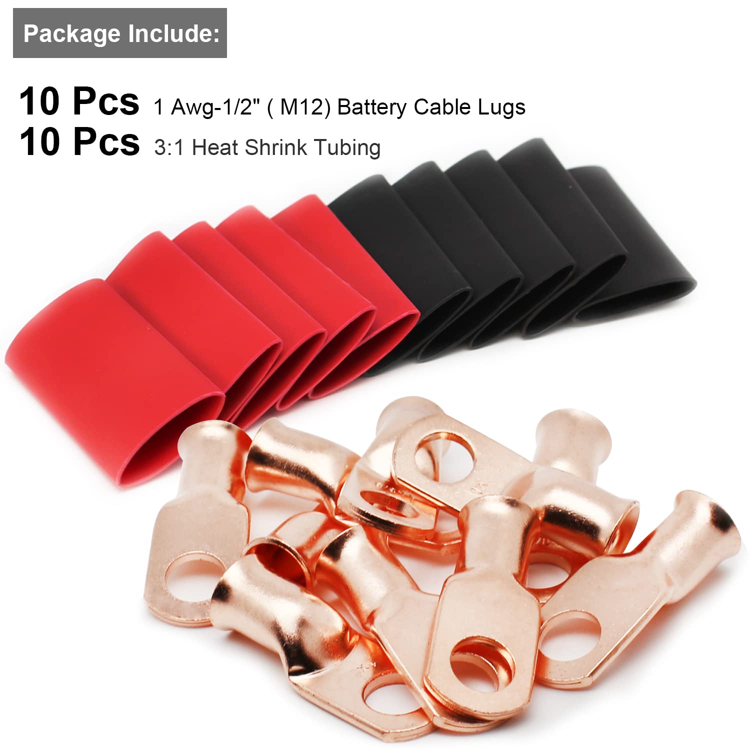 【What You Get:】 10 Pcs per pack of 1 Guage (AWG) 1/2" ring terminals, copper lugs closed end termination ring terminals with 10 Pcs 3:1 Dual Wall Adhesive Heat Shrink Tubing Tube for your work(5pcs Black and 5pcs Red).