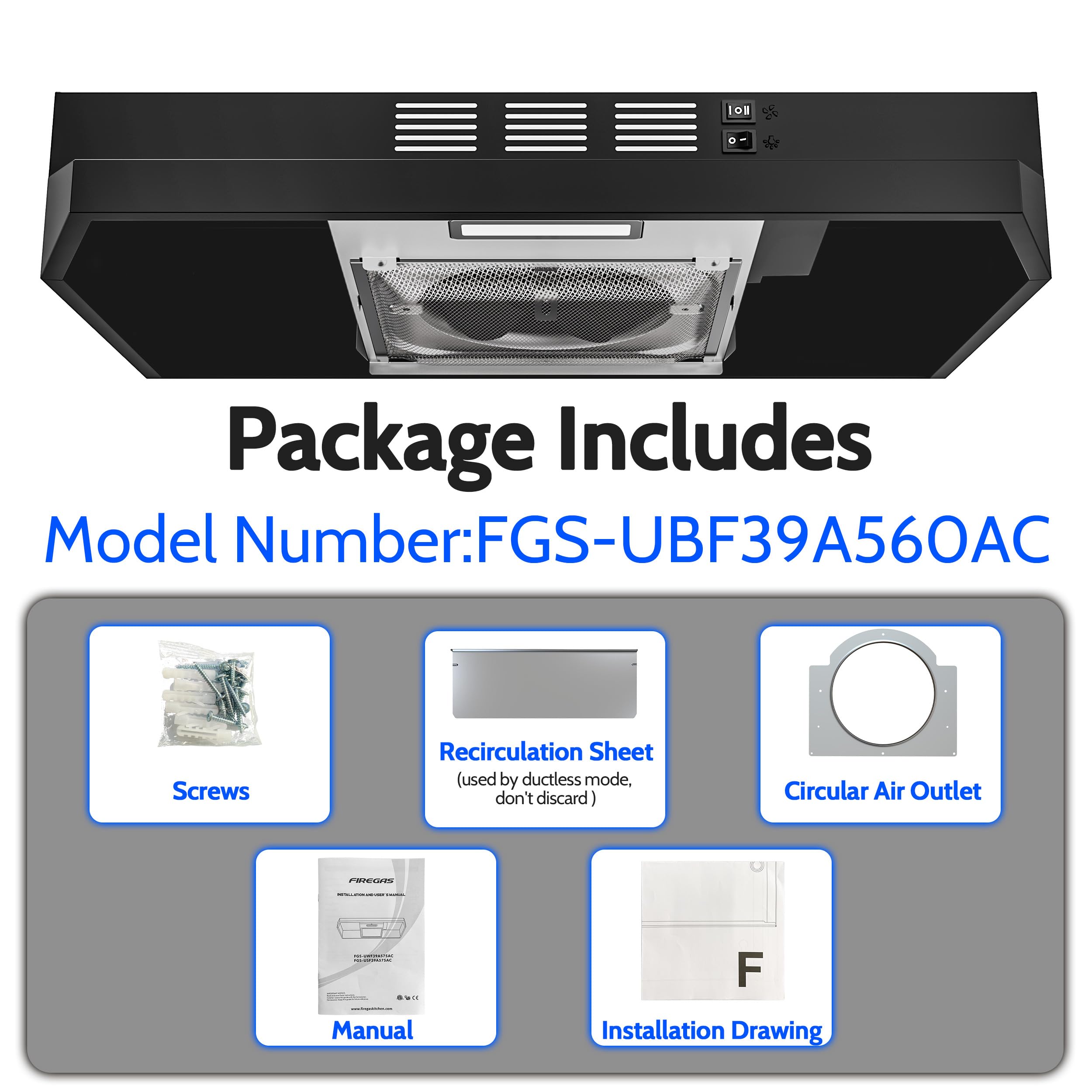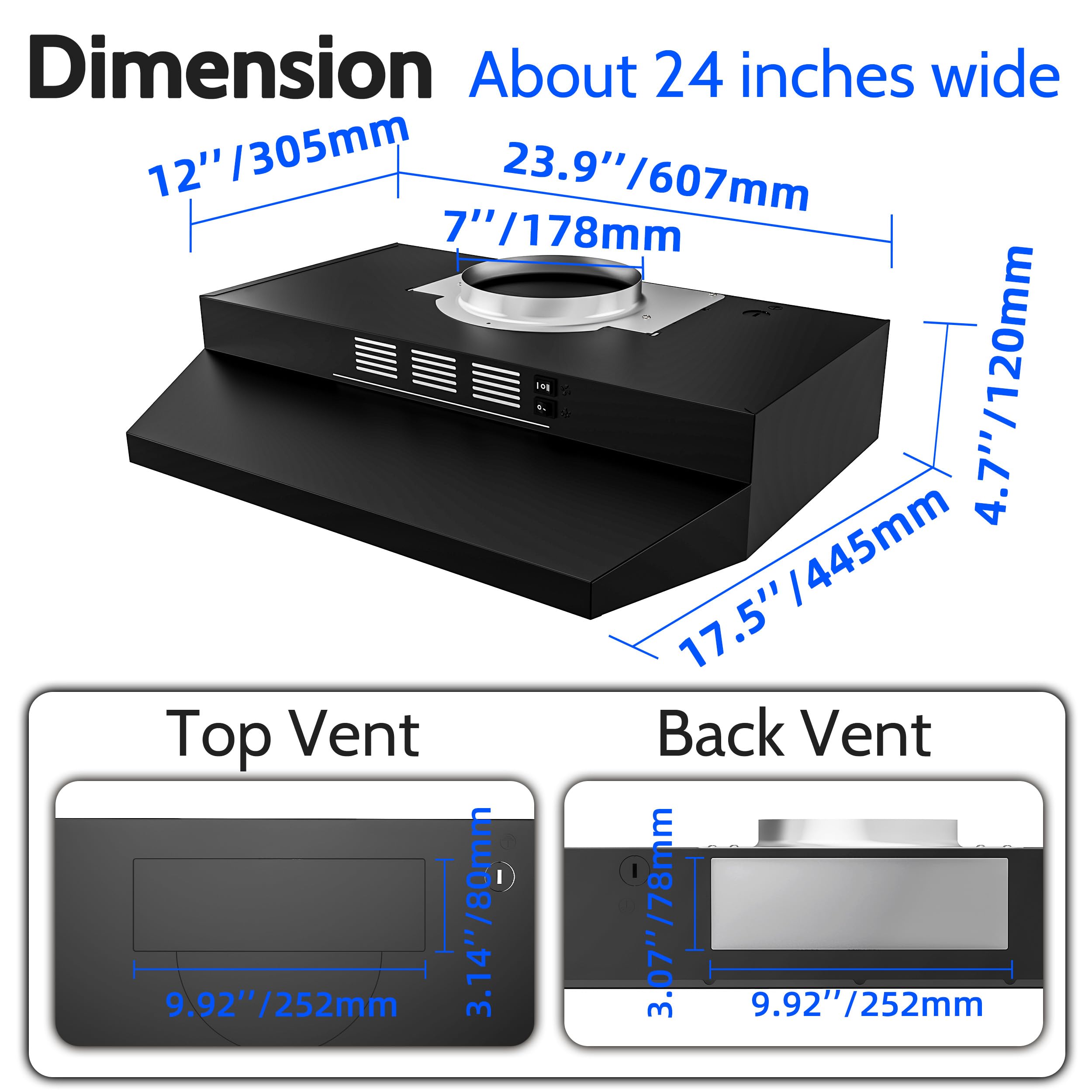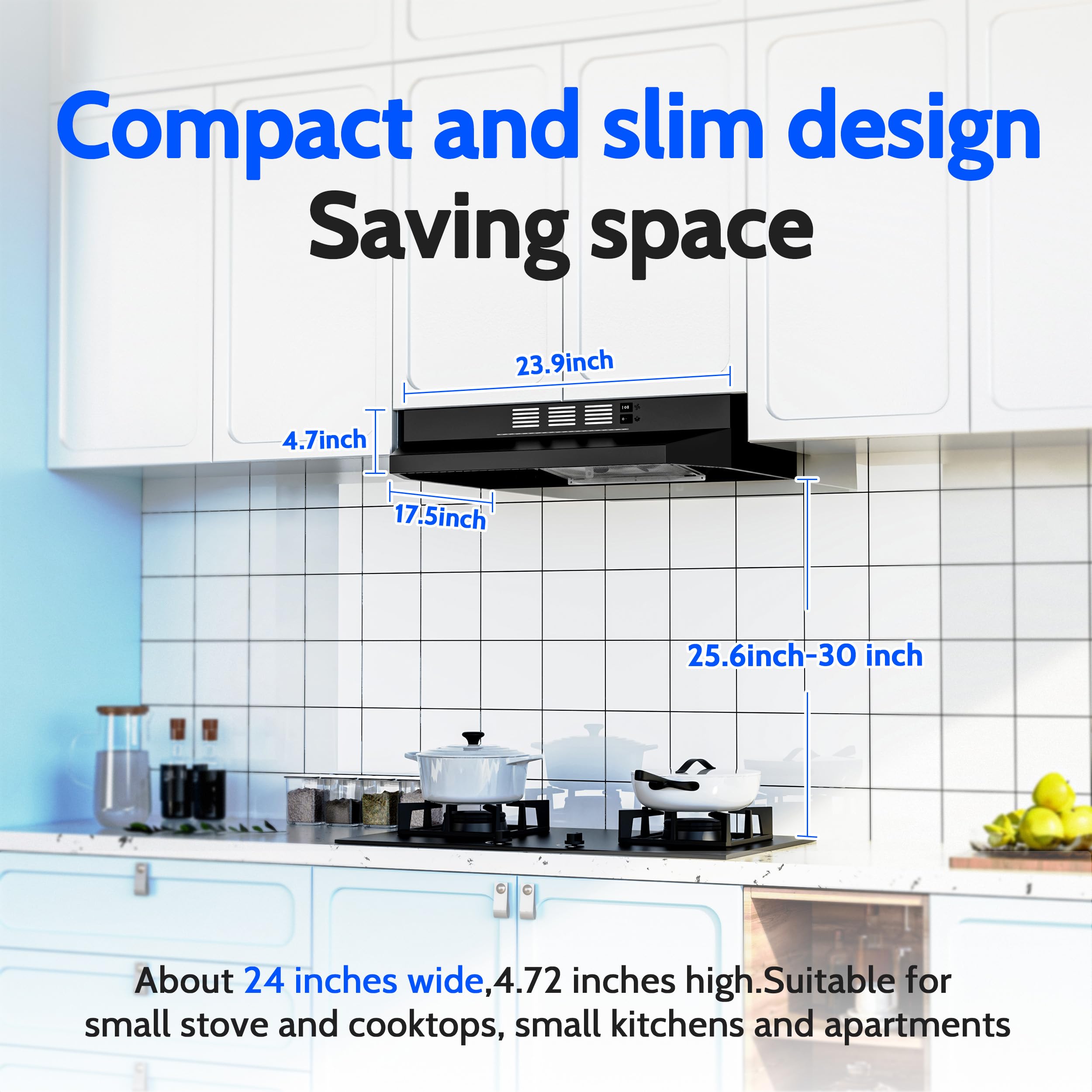 24 INCH RANGE HOOD: This FIREGAS black range hood has a flat design, which saves a lot of space, contemporary look, so this under cabinet range hood is a perfect complement to your kitchen