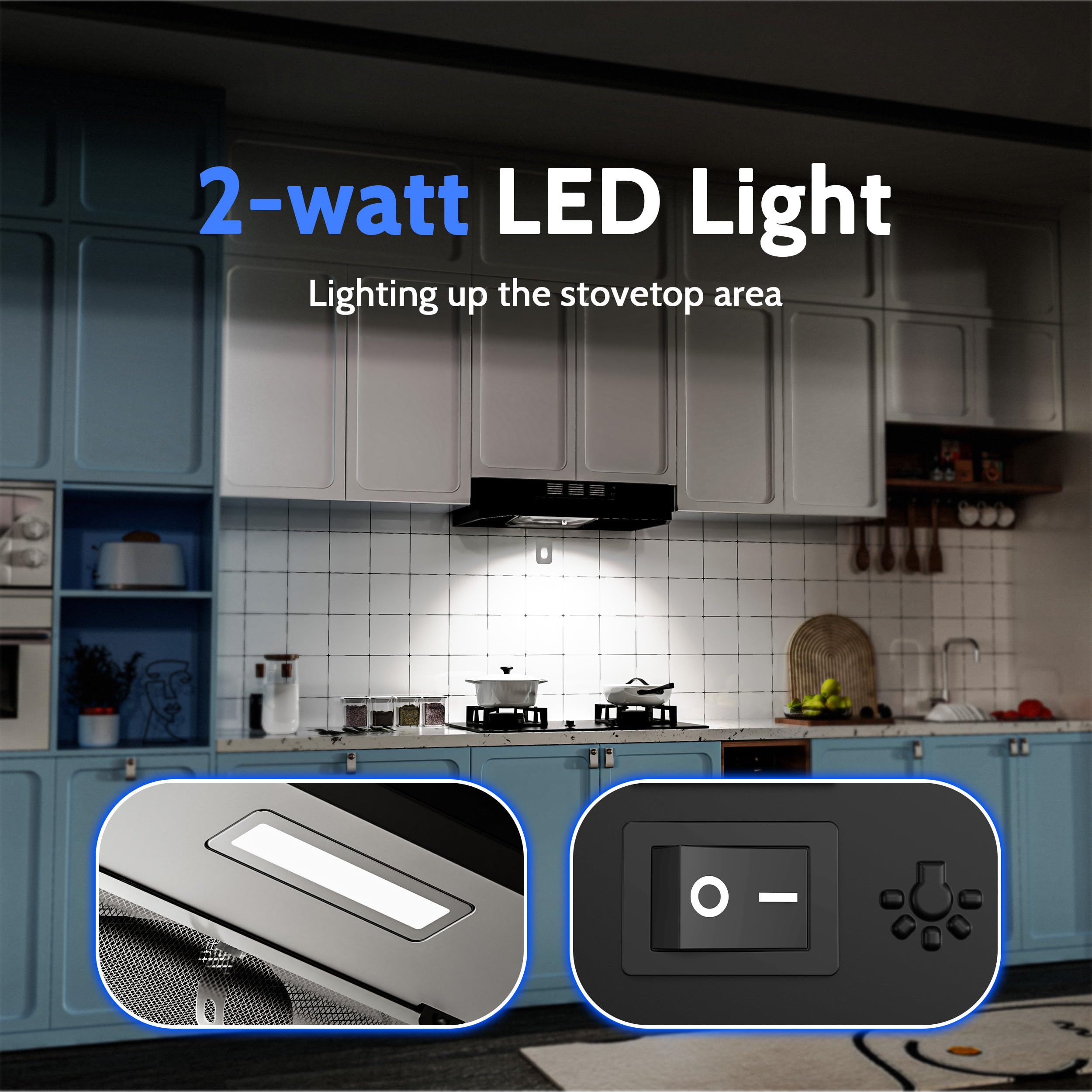 BRIGHT LED LIGHT: The 24 inch under cabinet range hood has a 2W LED light, which brightens your cooking area, ensuring optimal visibility for your culinary endeavors, It can also save energy in your kitchen