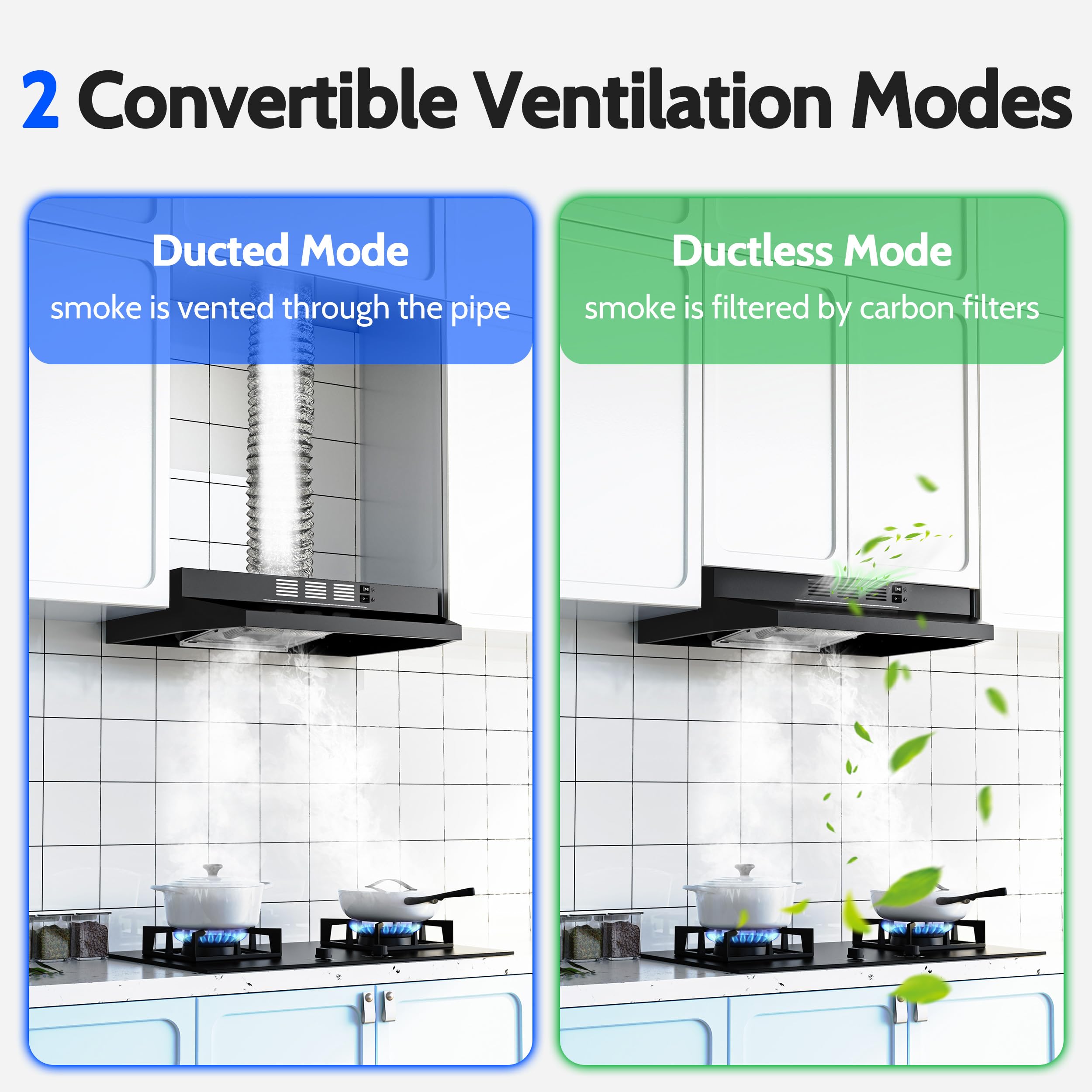 VERTICAL AND REAR EXHAUST: This black range hood can be vented from the top or rear. The top is a 7" round exhaust port, and the back is a rectangular exhaust port with 9.92(W)"x 3.07(H)". You can choose according to your kitchen exhaust system.