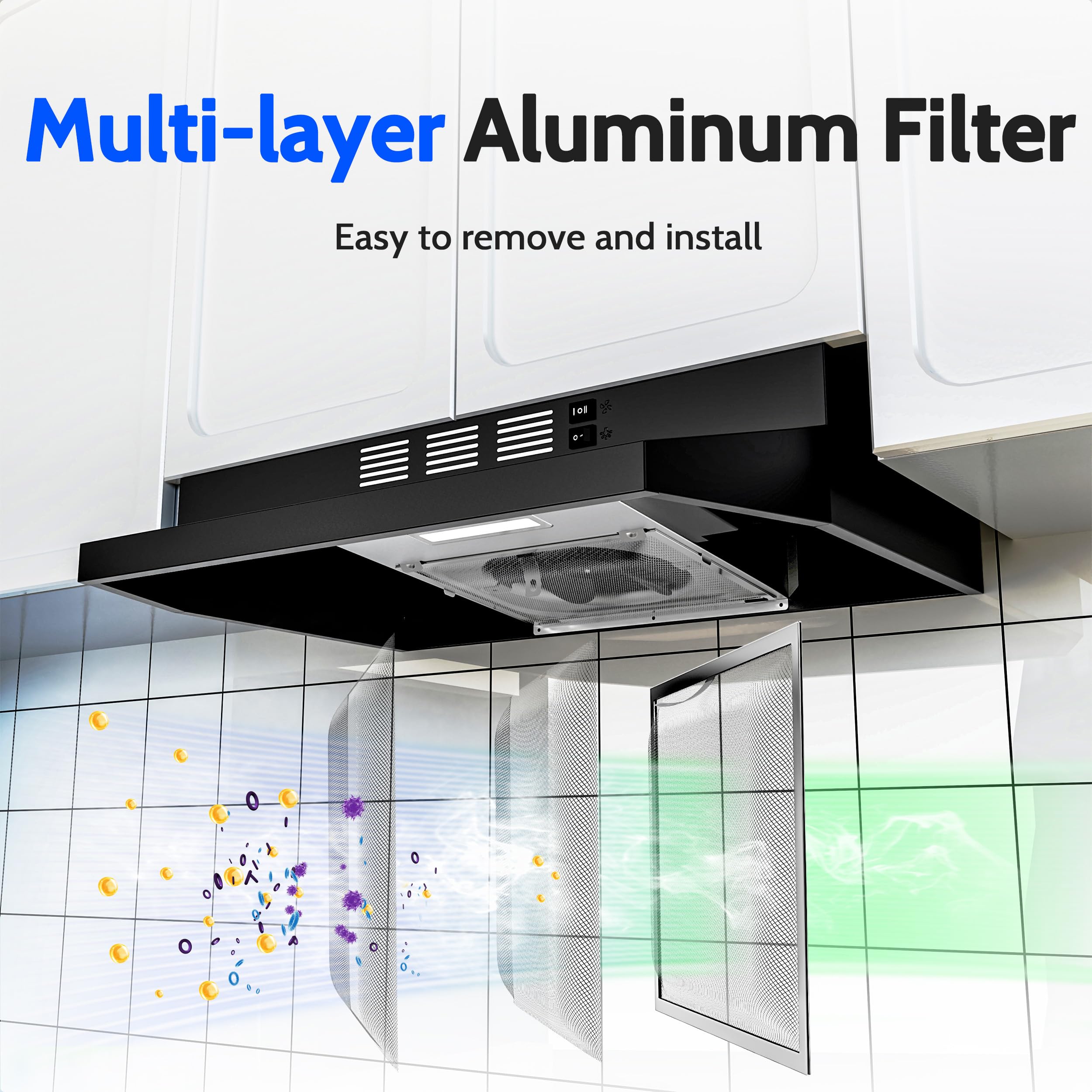 POWERFUL SUCTION VENT HOOD: 300 CFM large airflow with good balance fan efficiently removes large amounts of smoke and cooking odors with ease from your kitchen. Multi-layer aluminum filter with excellent filtration ability to capture grease and oil