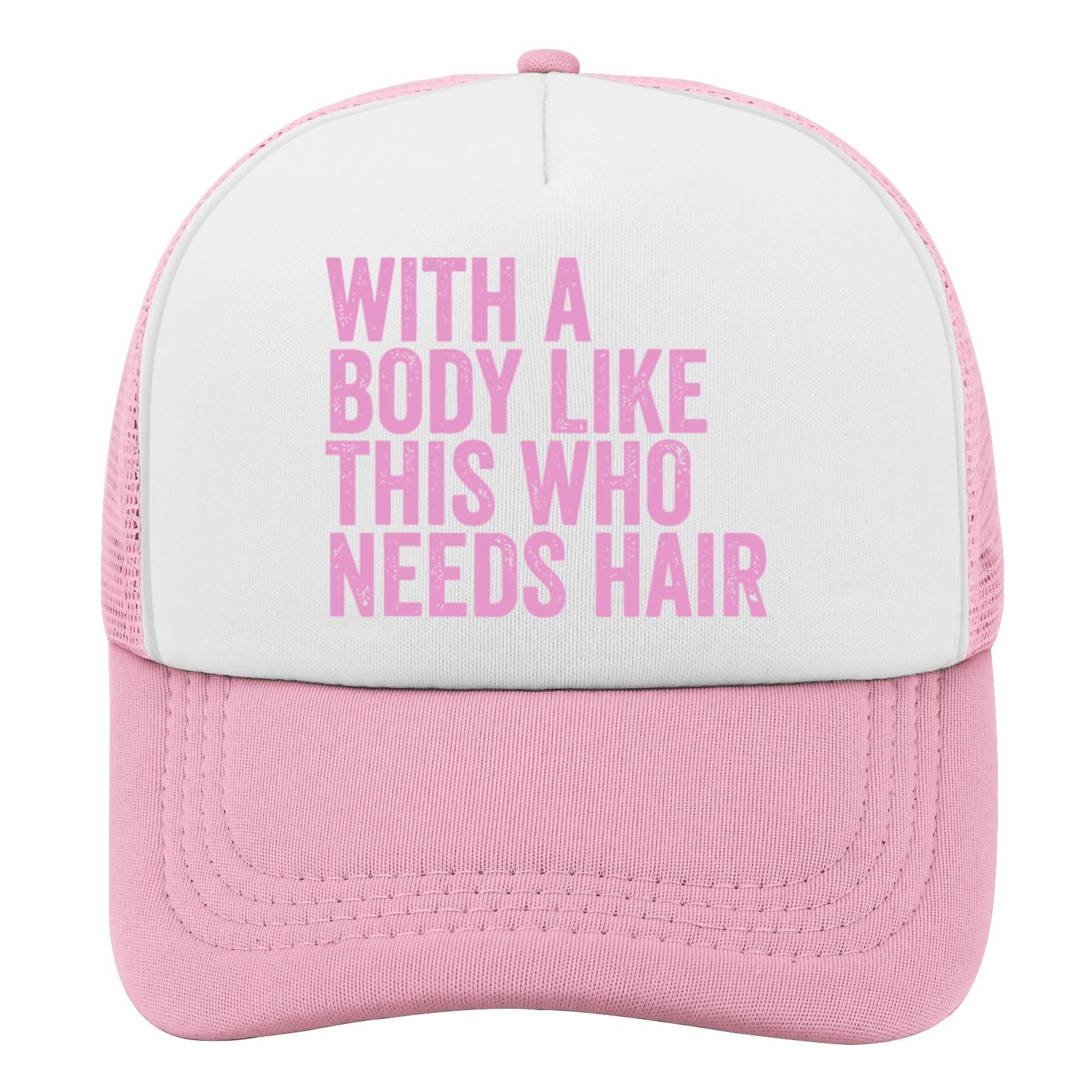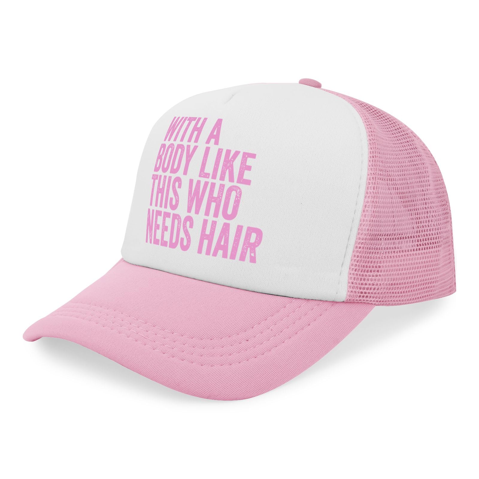 CLASSIC DESIGN: Pink and white trucker hat featuring mesh back construction with printed text graphic on structured front panel for a playful casual look