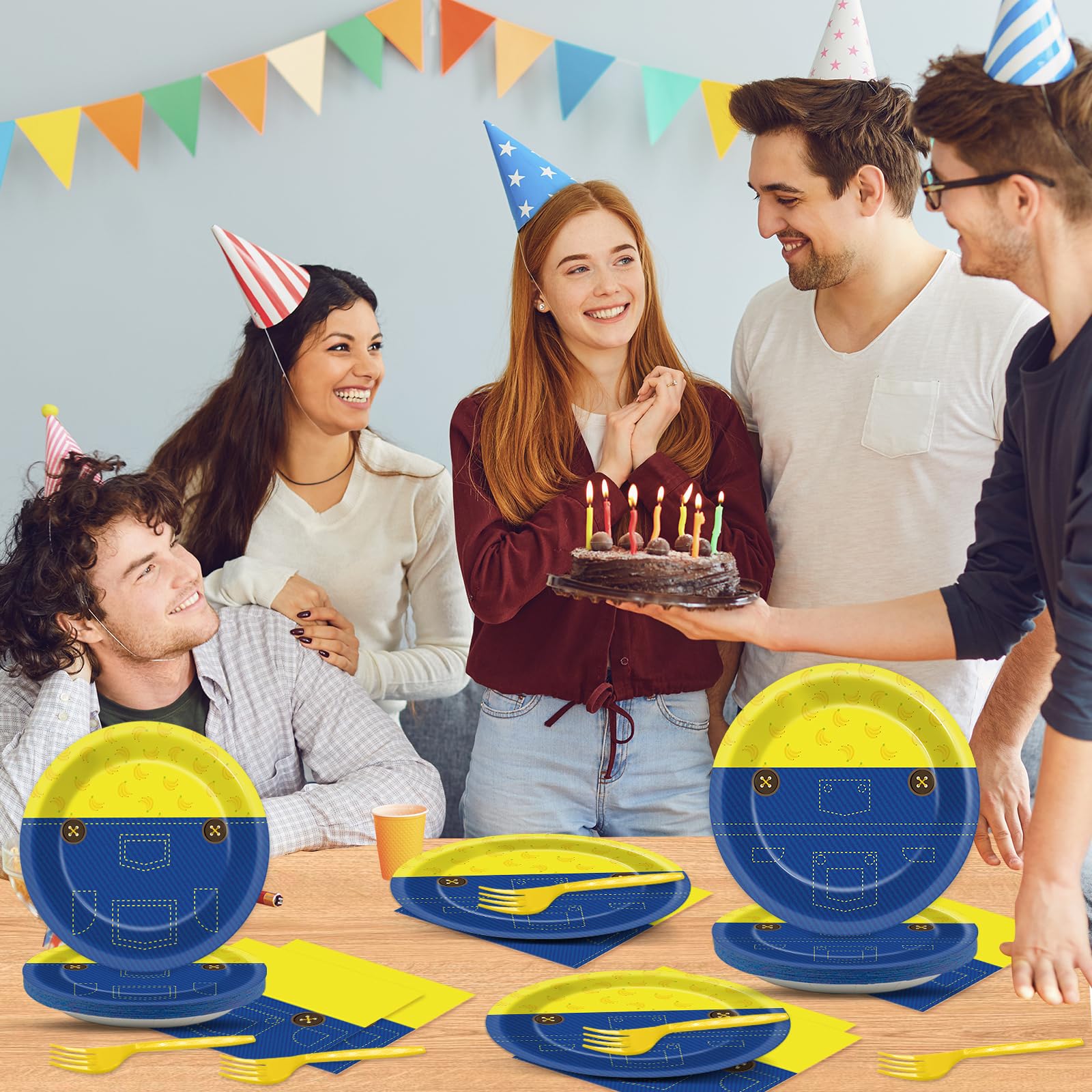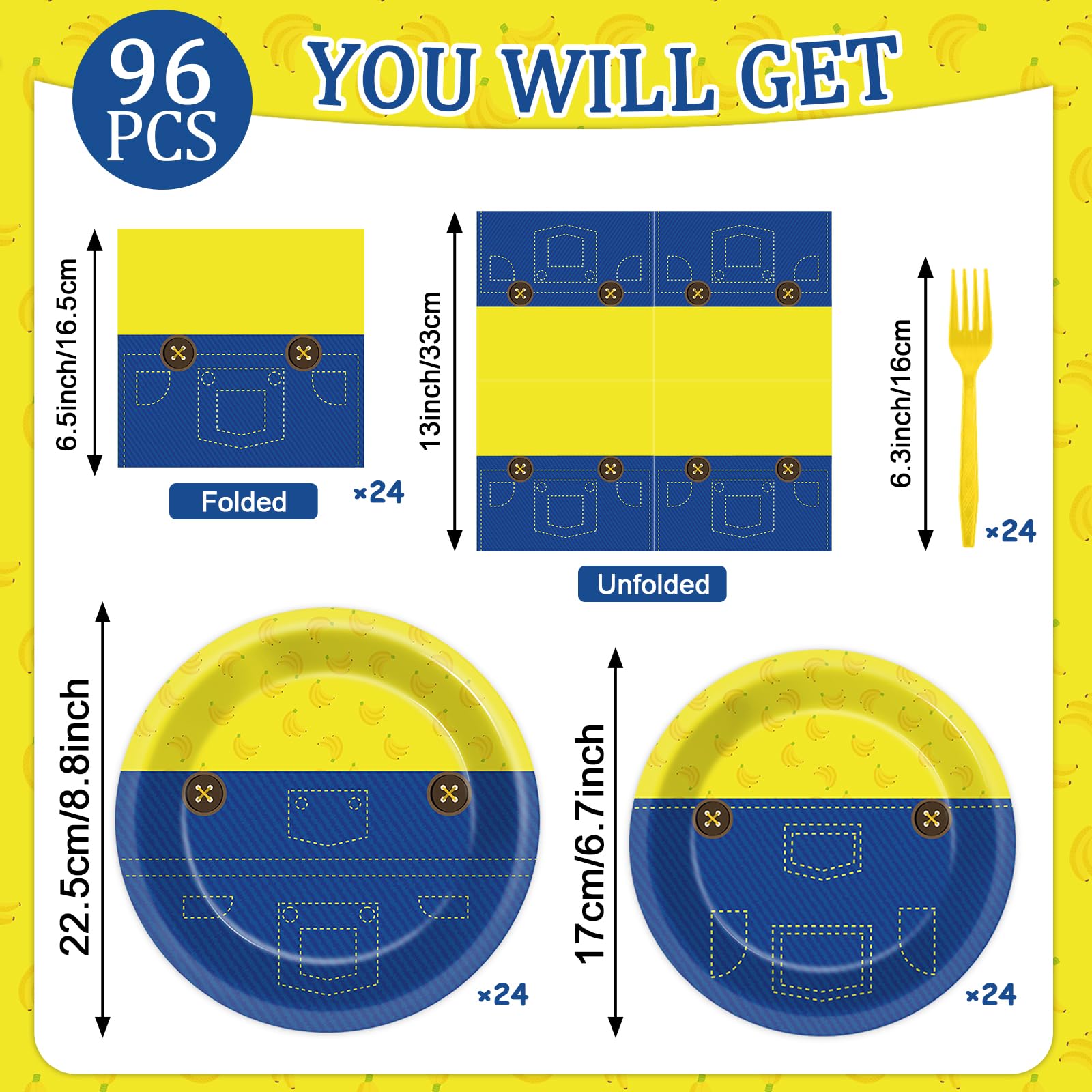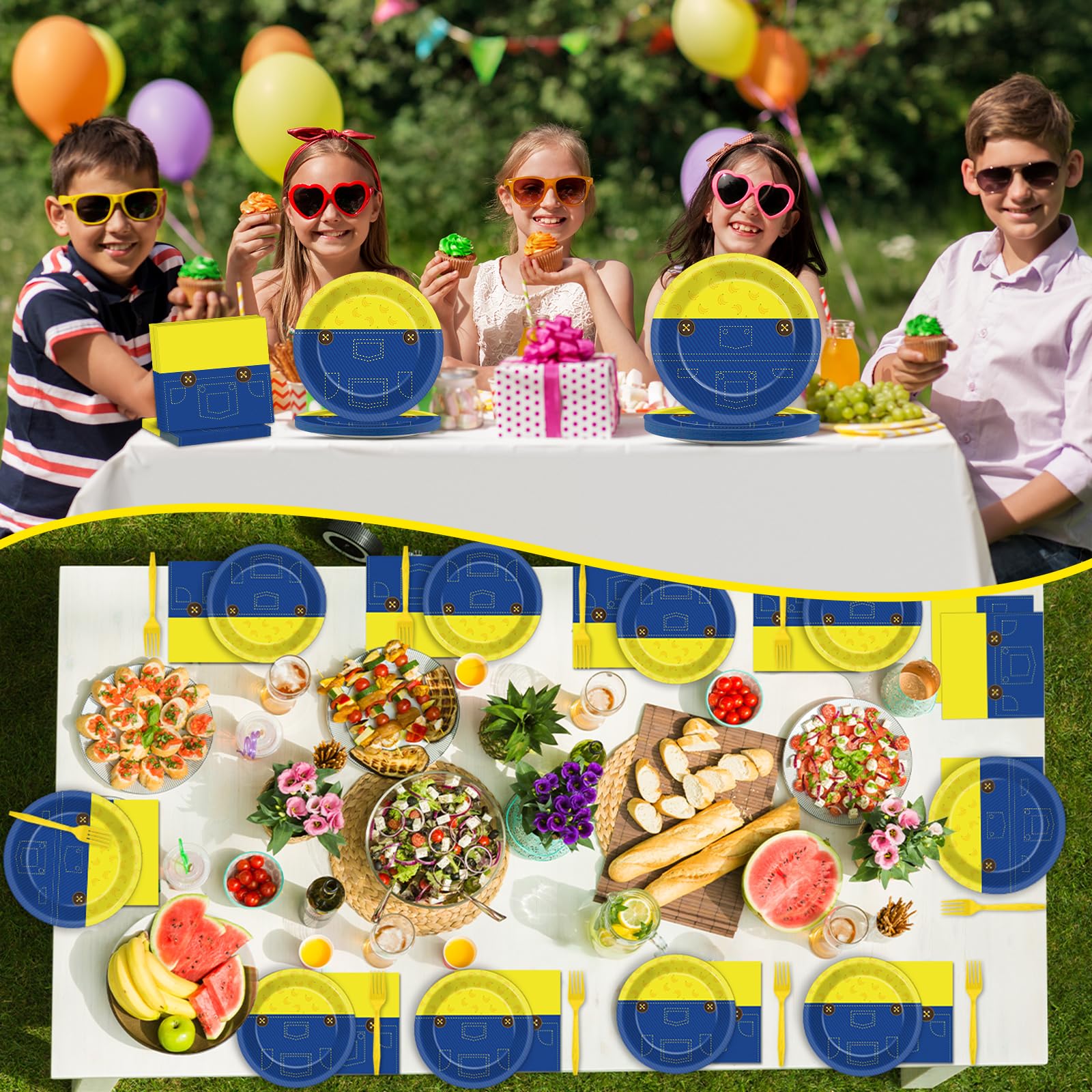 Package Includes: This yellow cartoon birthday party decorations set includes 24 x 9 inch yellow and blue dinner plates, 24 x 7 inch yellow jeans dessert plates, 24 x 6.5 inch yellow blue napkins, and 24 yellow forks, ideal for serving 24 guests. The yellow theme cartoon tableware features cute cartoon designs with yellow and blue accents, creating a fun and joyful tableware solution for kids' birthdays, baby showers, and themed celebrations.