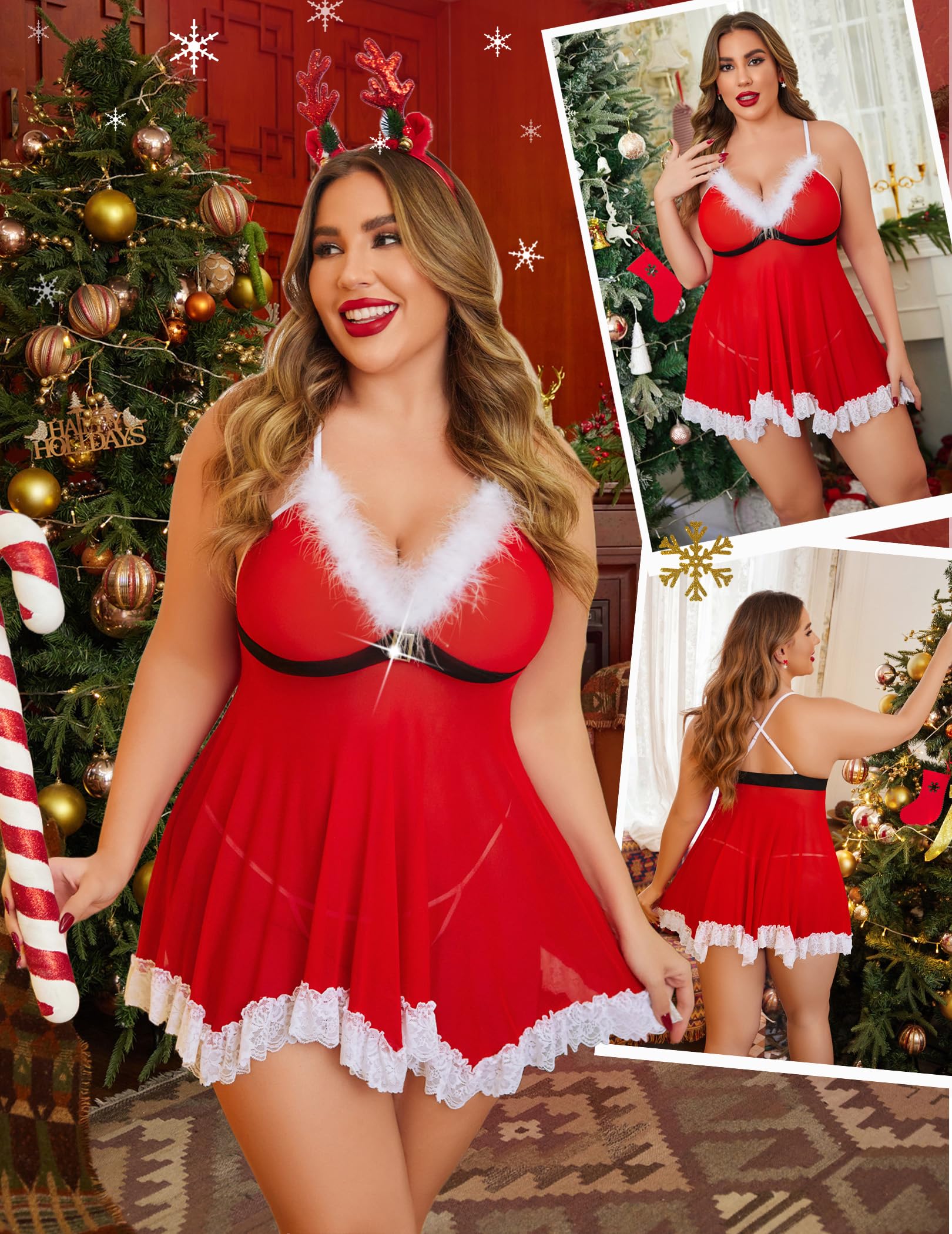 ❤ Design: Plus size santa chemises, chest tightening and hem opening, black belt stitching, deep v-neck, white feathers edge, sexy floral lace, spaghetti straps, adjustable cross-straps, matching see-through thongs! The design of christmas lingerie can help show your curves but hiding the flaws!