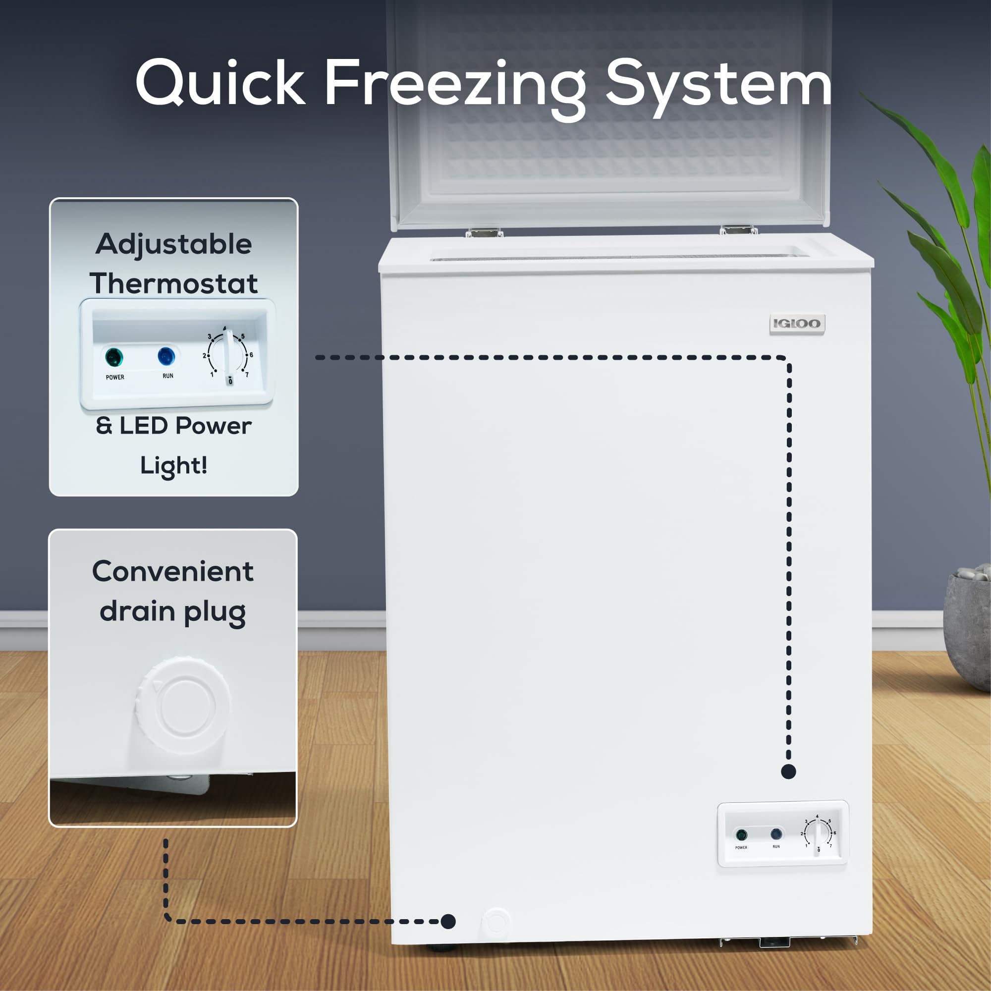 This Igloo 3.5 Cu. Ft. Chest Freezer offers the space to accommodate all your storage needs! Perfect for stocking up on frozen food such as meat, pizza, fruits and vegetables, ice cream, ice and more – this reliable chest freezer has a quick freezing system with a mechanical temperature control that is easily accessible. The convenient and removable storage basket allows you to store the small things you don’t want to get lost!