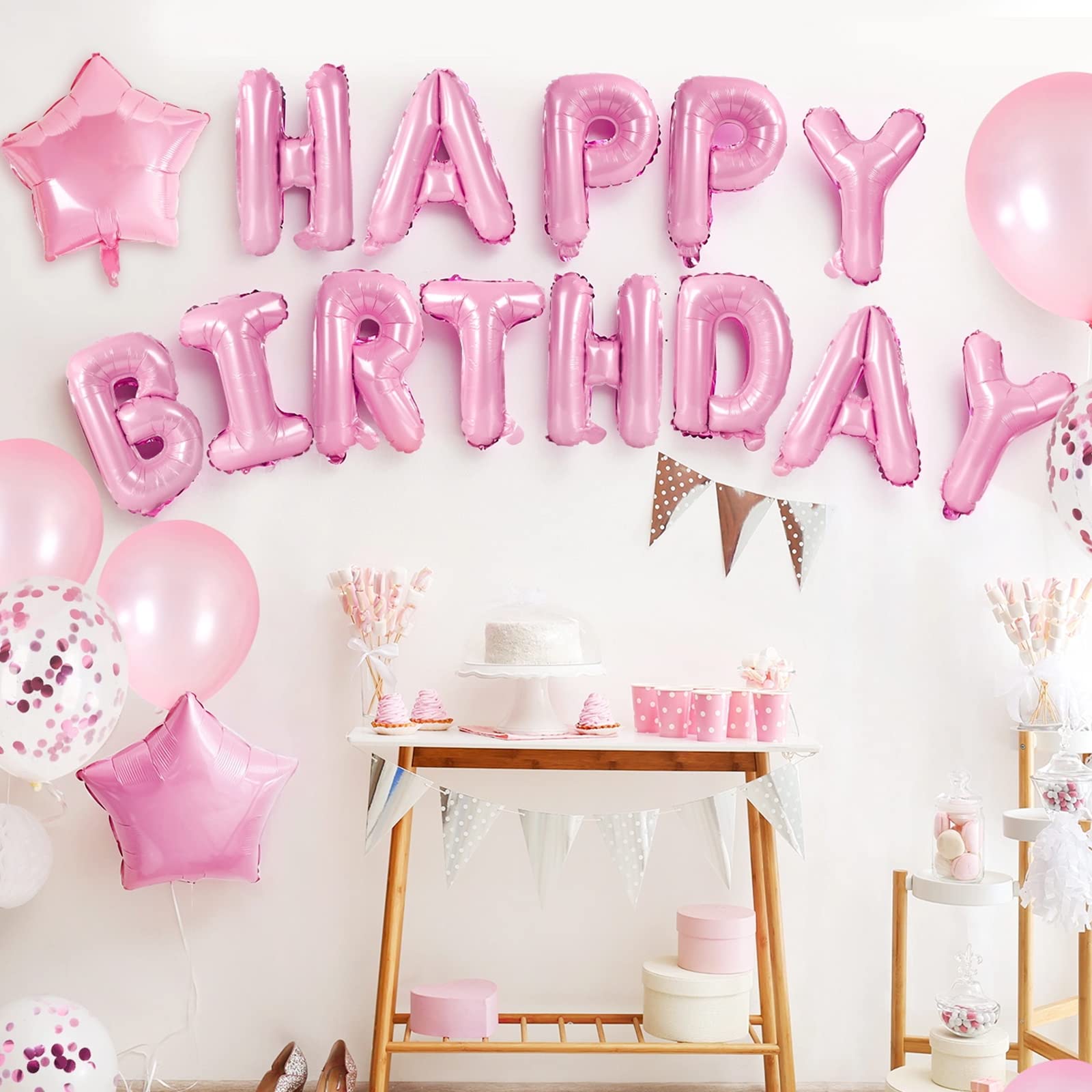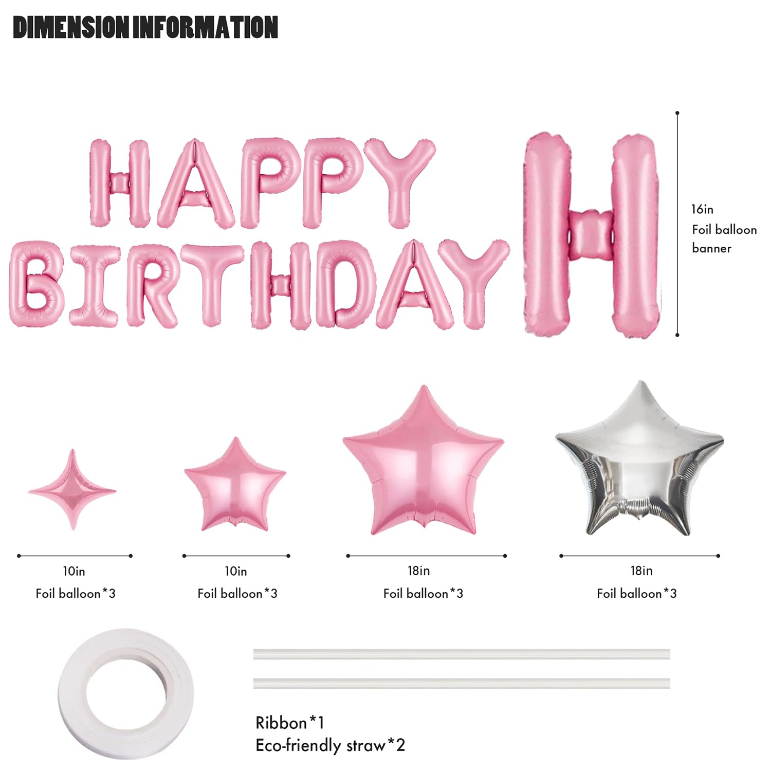 🎈VALUABLE PACK : Each package come with ①Pink Happy Birthday letters x13pcs(16in) ② Pink four-pointed star x3pcs (10in)③ Pink five-pointed star x3pcs (10in) ④ Pink five-pointed star x3pcs+Silver five-pointed star x3pcs (18in) ⑤Plastic straw x2pcs ⑥Ribbon x1pcs.