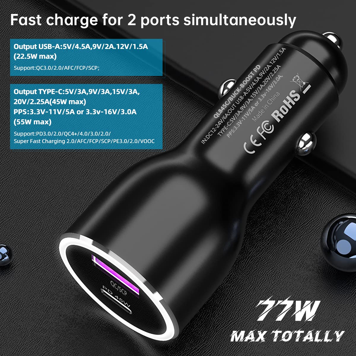USB A+C Port & Buck-Boost Smart Chip: This double port Samsung car charger type c can deliver rapid charging for most portable digital devices due to USB-A and Type-C port with Buck-Boost Smart Chip. It will detect the right voltage for your devices automatically from 5V-20V. So it fits for iPhone, Samsung, Pixel, Moto, LG, MacBook, Nintendo Switch/Lite/OLED, Camera, GPS, other cell phone and USB-C Laptops.