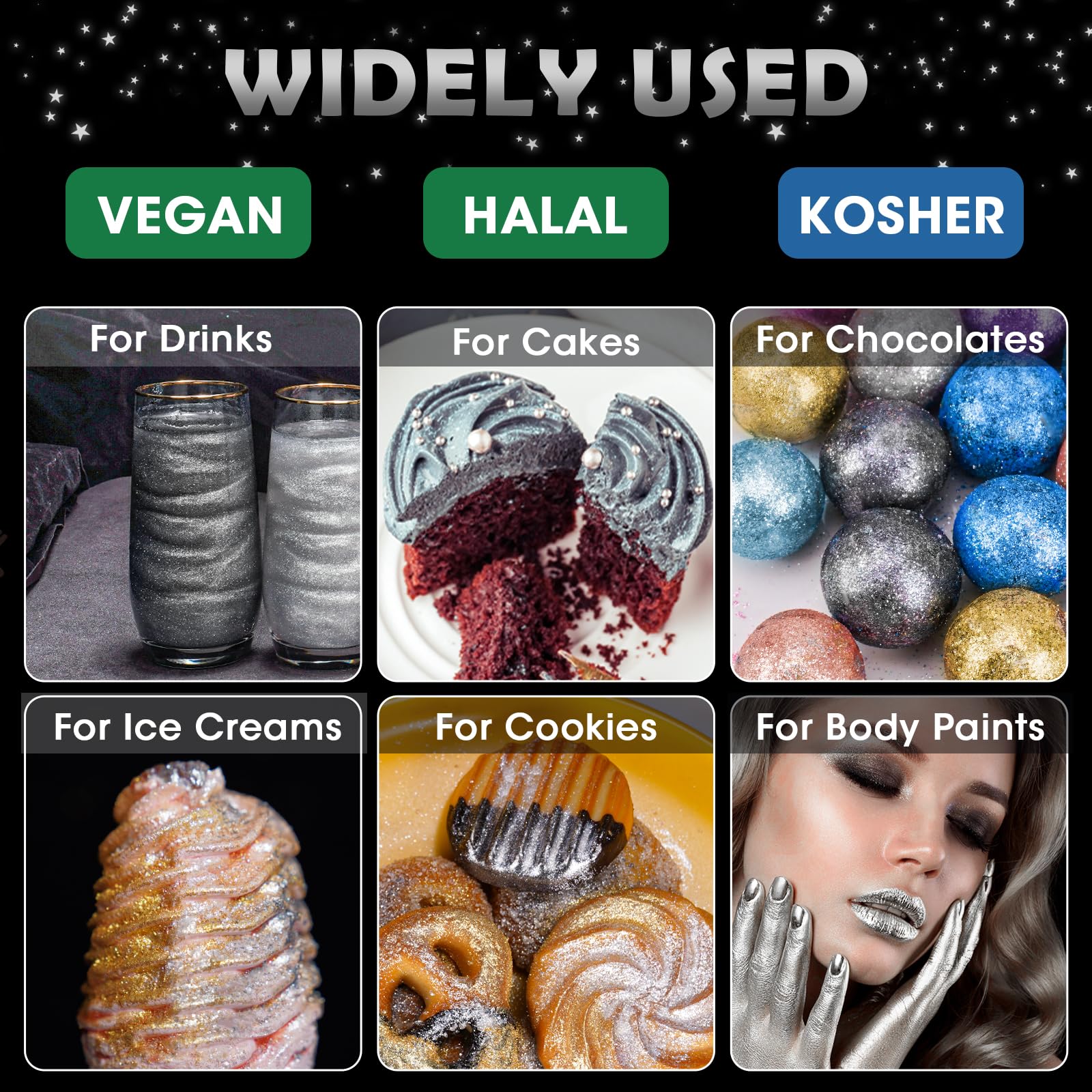 🌟【Vegan & Allergen-Free】Food-grade glitter uses only the highest quality vegan ingredients and does not contain common food allergens, including gluten, nuts or dairy products, so everyone can use and enjoy this product regardless of diet or food allergies. Unlike food contact glitter, these are 100% edible, so you don't need to worry about using them in your creations to make them sparkle for all.