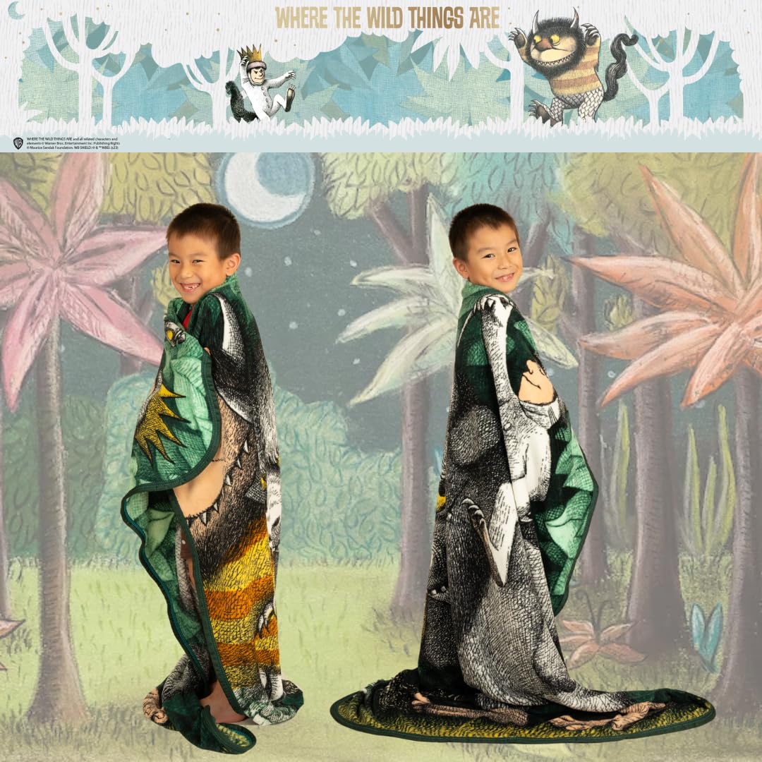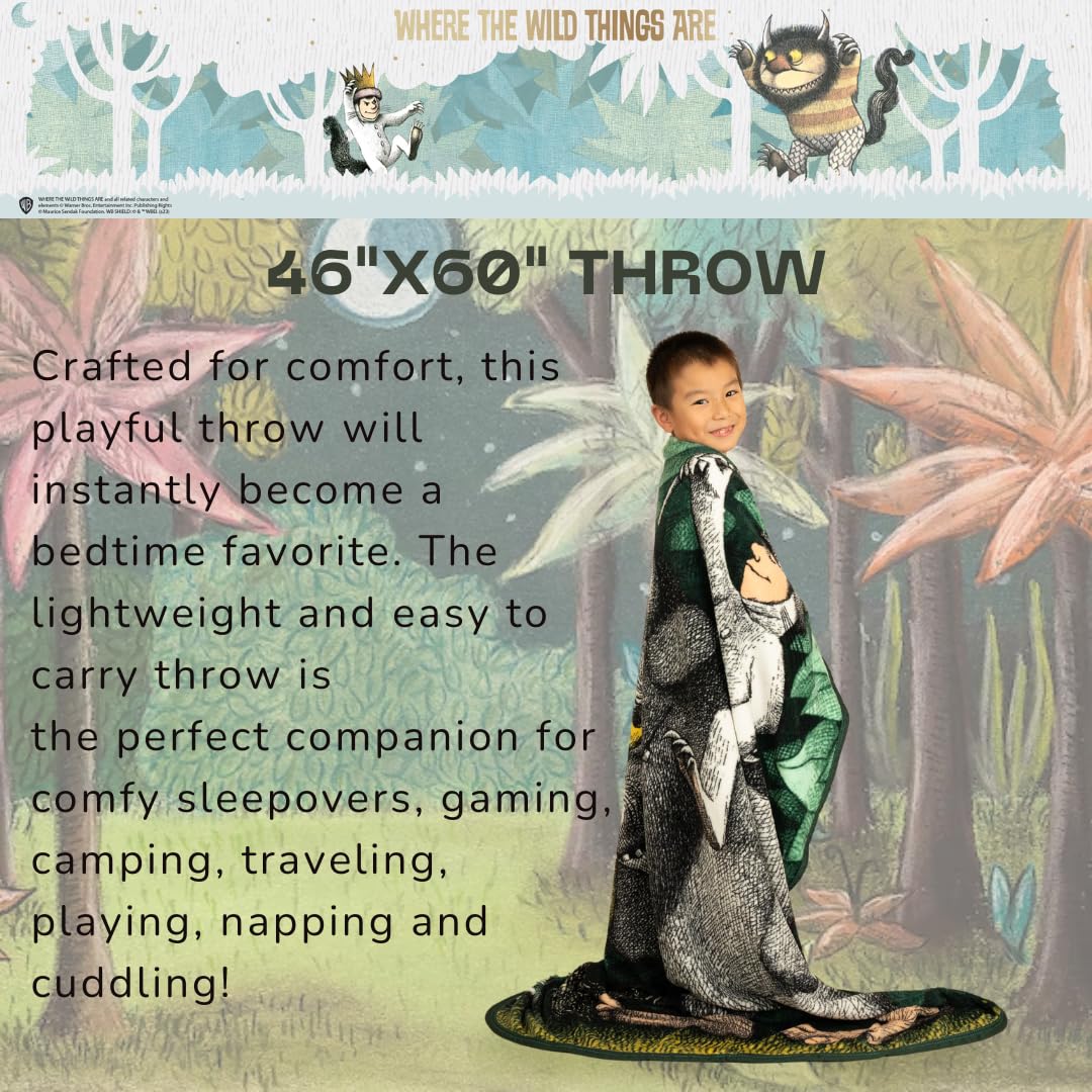 WHERE THE WILD THINGS ARE DESIGN: Whimsical 'Where The Wild Things Are' throw depicts Max, crowned and riding a Wild Thing, amidst a captivating world of imagination. A cozy tribute to the cherished tale, inviting adventure and comfort.