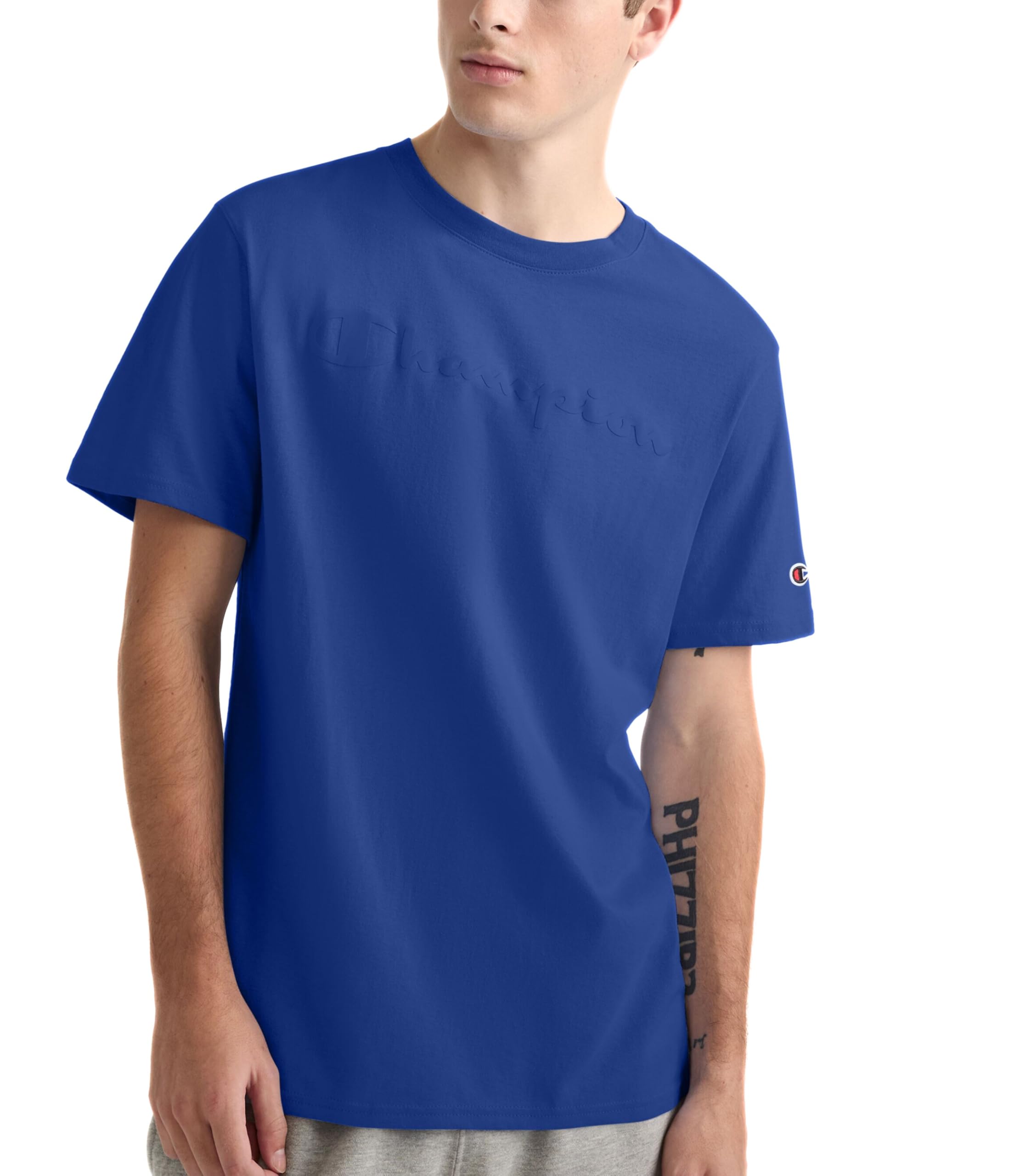Description Our Champion heritage tee, available in solids and prints, is heavyweight 7 ounce. Jersey fabric. Champion graphics are truly inspired by our archives and our long history of athletic wear. Champion - a step above.