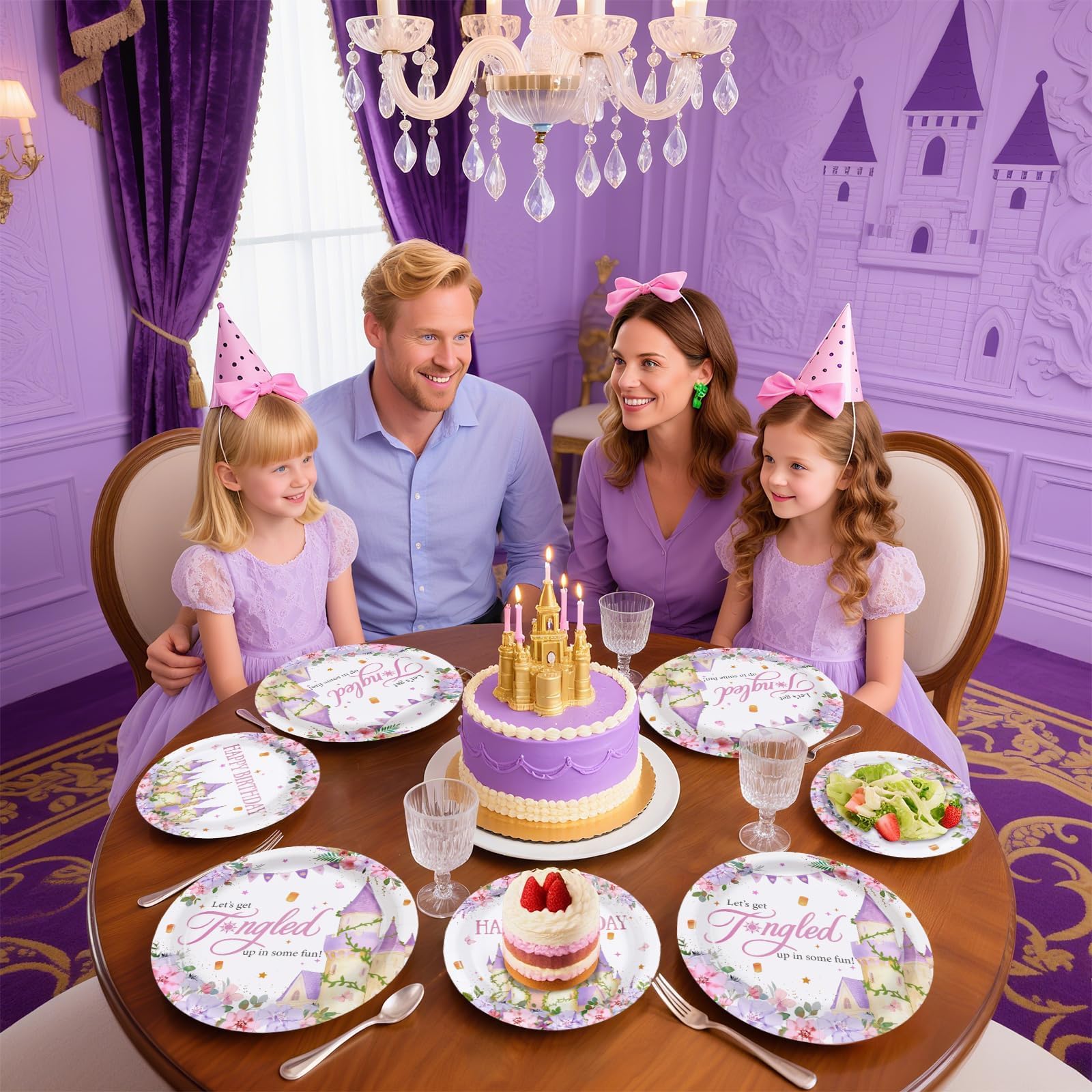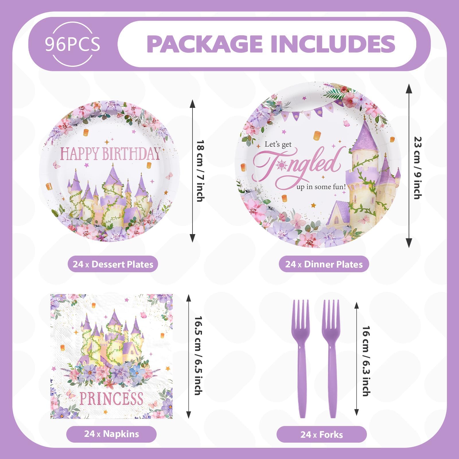 Princess Birthday Party Supplies: Our 96 pcs purple princess tower tableware set includes 24 9" dinner plates, 24 7" dessert plates, 24 napkins and 24 forks, which can serve 24 guests. Designed for the wonderful princess themed birthday girl, this purple princess tower decorative dinnerware provides the perfect party experience