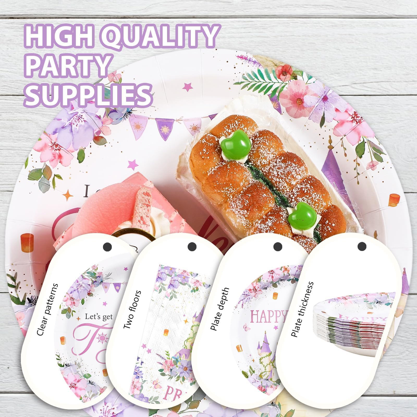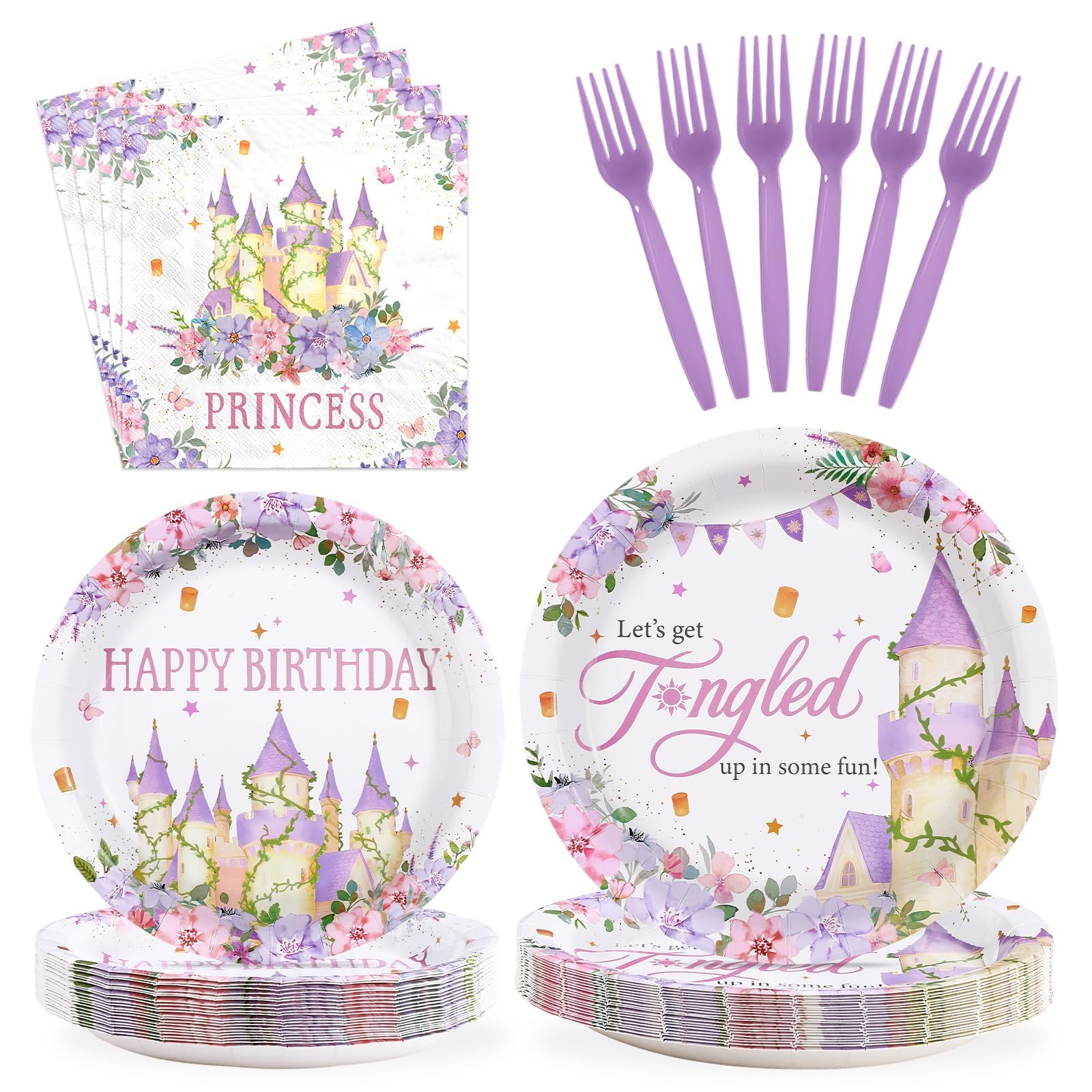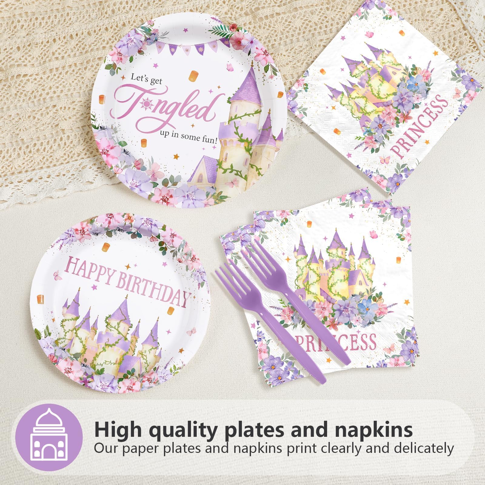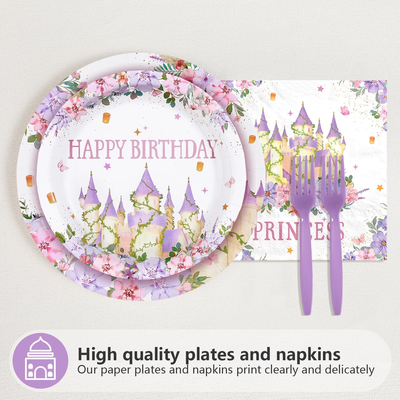 Princess Purple Tower Design: The floral castle party decorations tableware feature an adorable princess tower design, designed to make your little one's birthday party extra special. It shows “HAPPY BIRTHDAY” in charming letters, adding a whimsical and magical touch to your little one's milestone celebration
