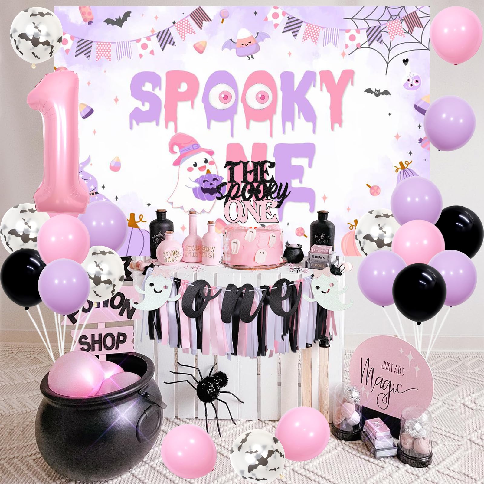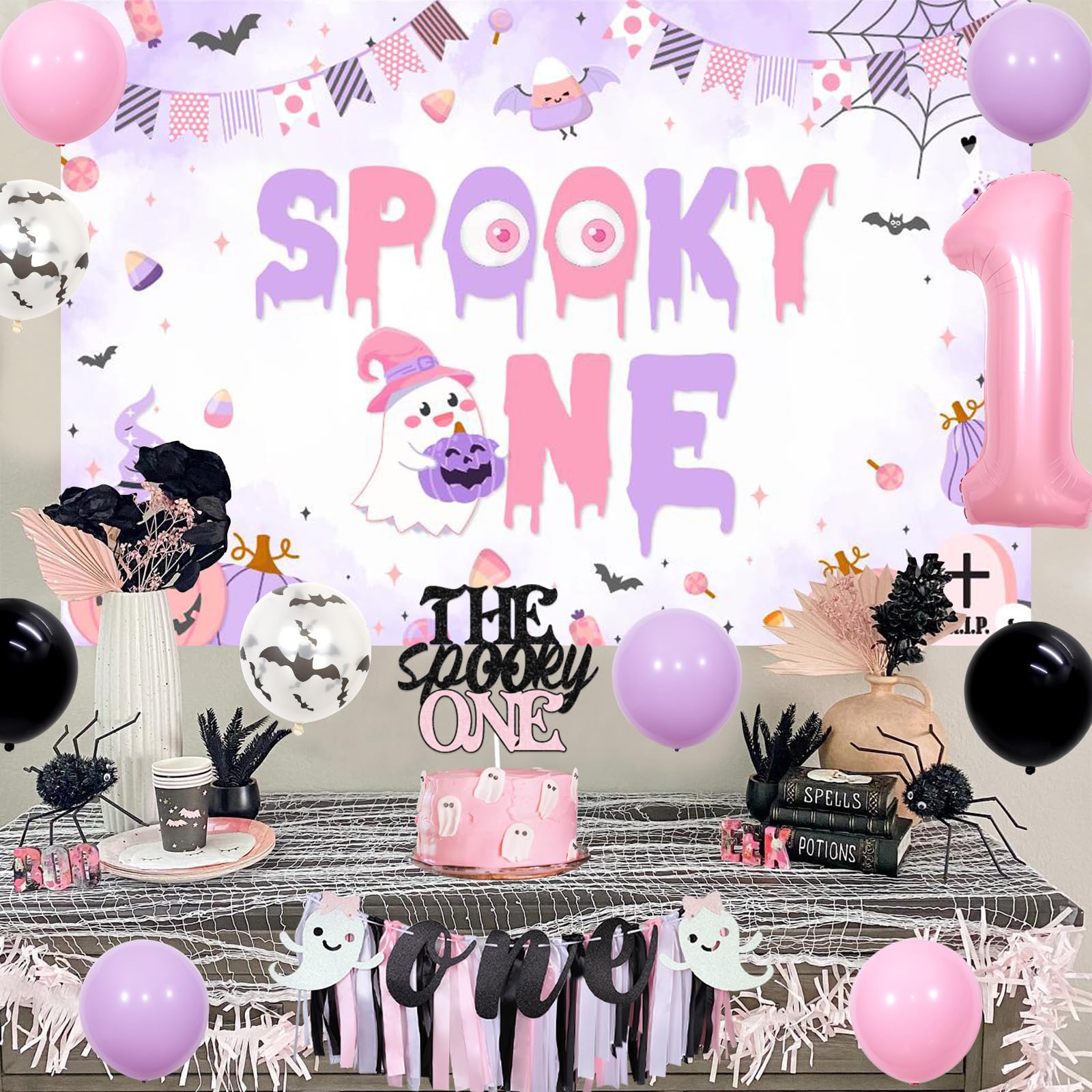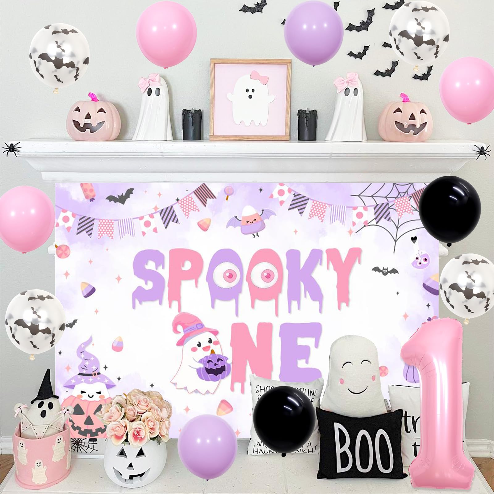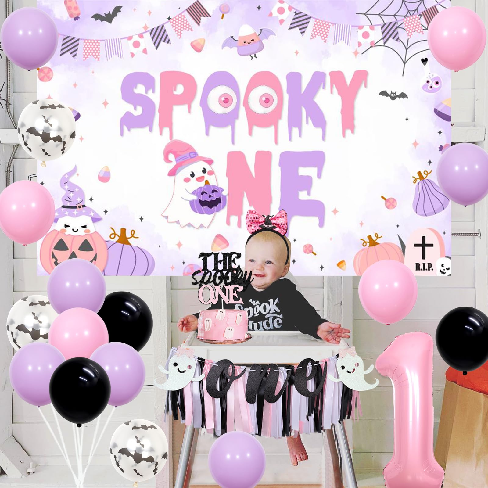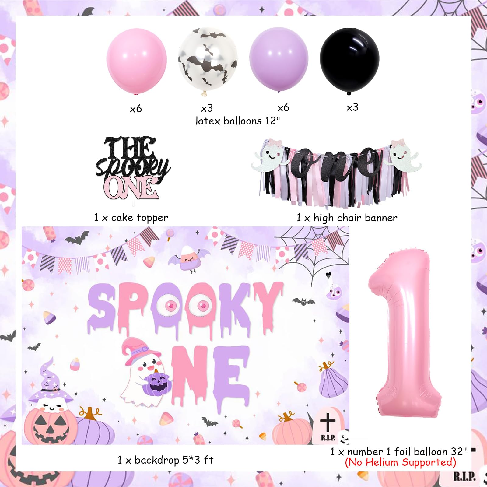 The Spooky One Birthday Decorations: Include 1pc spooky one backdrop 5*3 ft, 1pc ghost one high chair banner, 1pc the spooky one cake topper, 18pcs latex balloons 12”, 1pc number 1 foil balloon 32”.