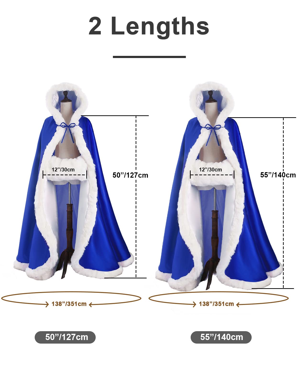 2 AVAILABLE LENGTH FOR YOUR DIFFERENT HEIGHT--- Cloak length: 50, 55-inch(from shoulder to end of train).You can choose different length as your height and need.