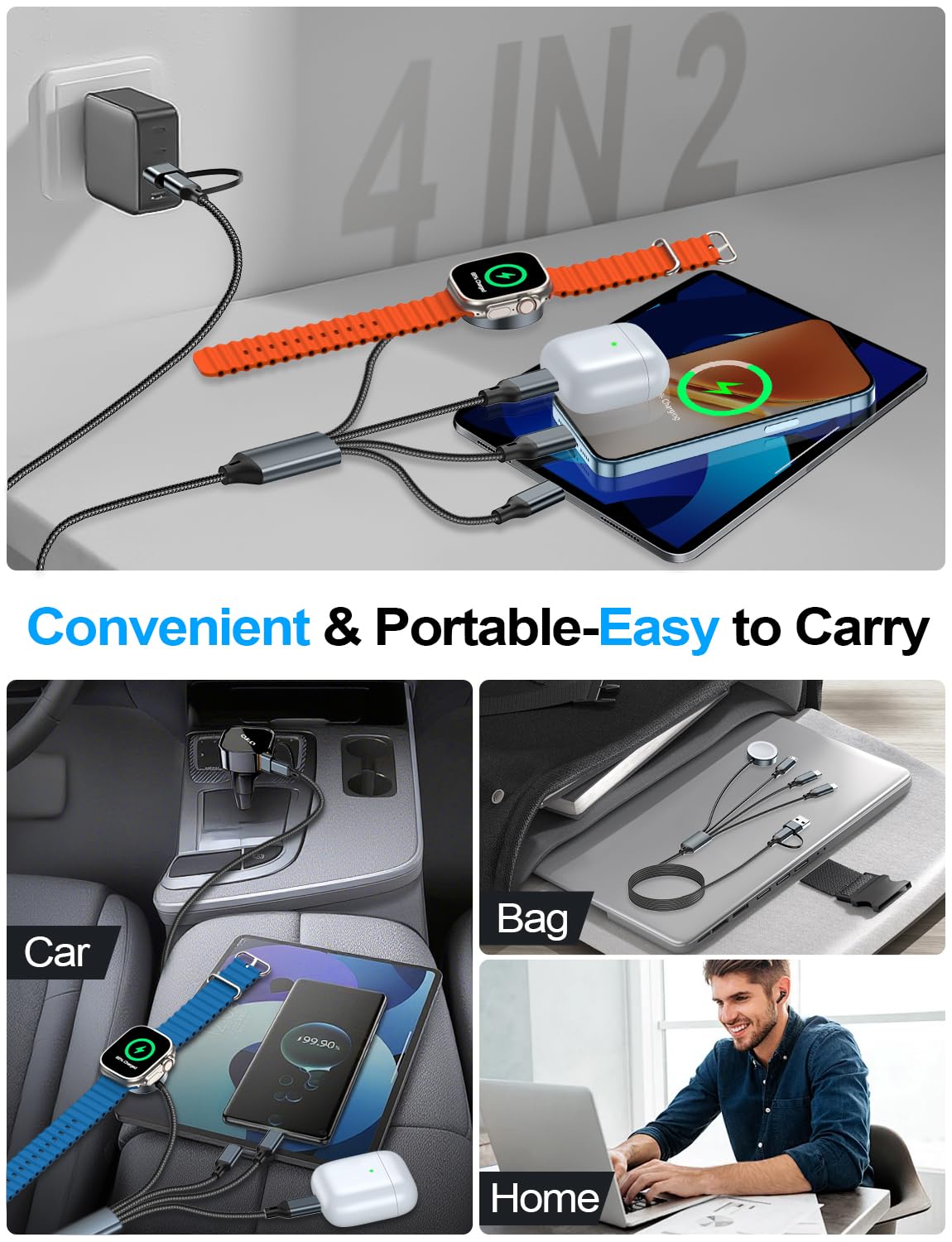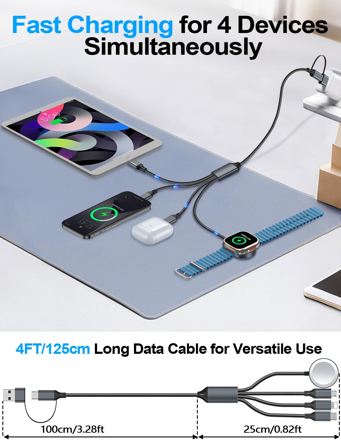 【Travel Vacation Essentials & Convenient】This 4-in-2 Type C/USB A cable is a travel essential and convenient to carry around with lightweight.Use this portable charging cable compatible with Apple Watch/iPhone and Samsung devices on flights, in cars, or with power banks–suitable for home, office, and travel accessories,just charging your Apple watch/iPhone/Samsung or any other devices at anytime.One Charging cable is enough for all your devices to charging, it is also suitable for PS4 charger.