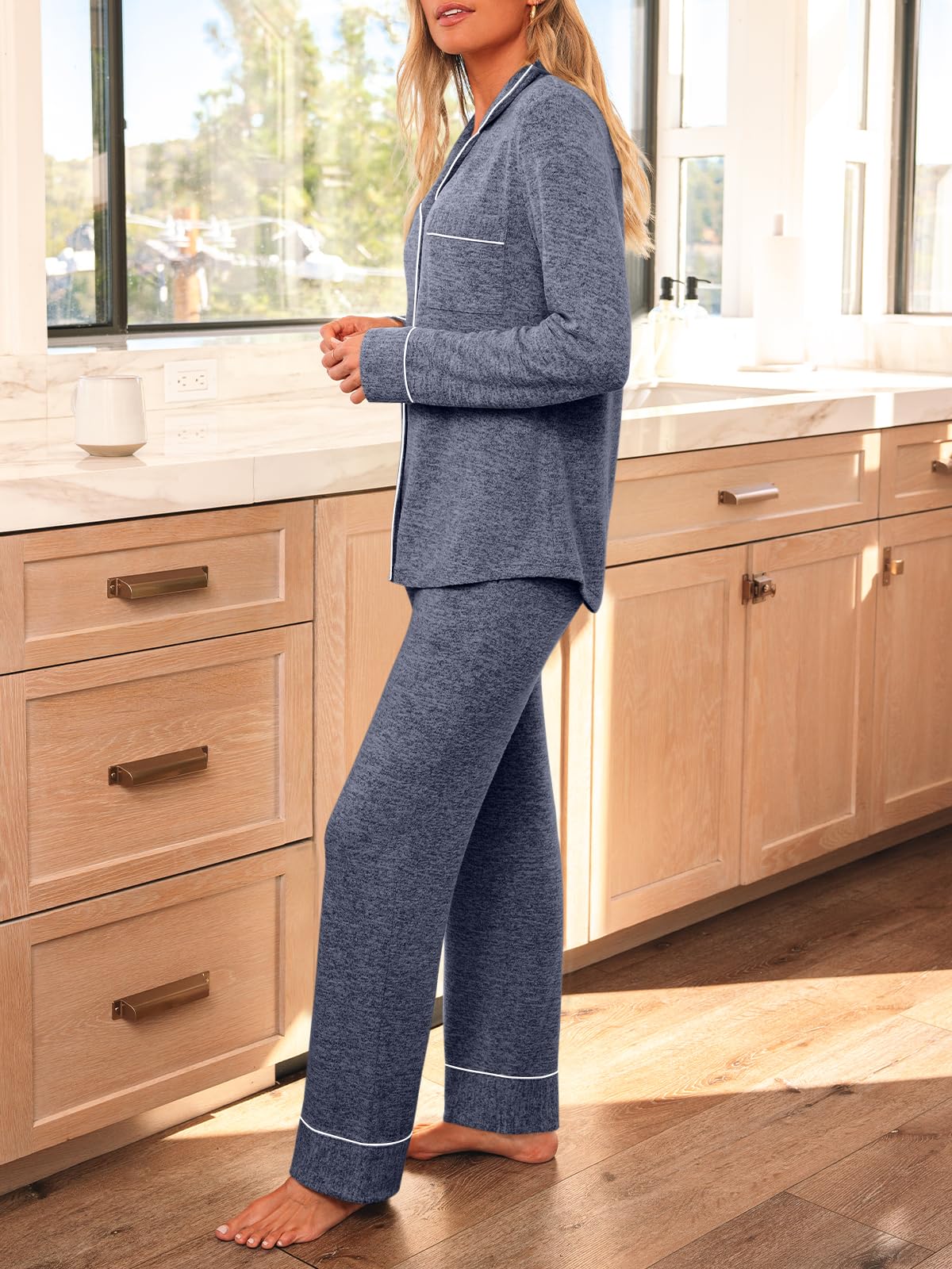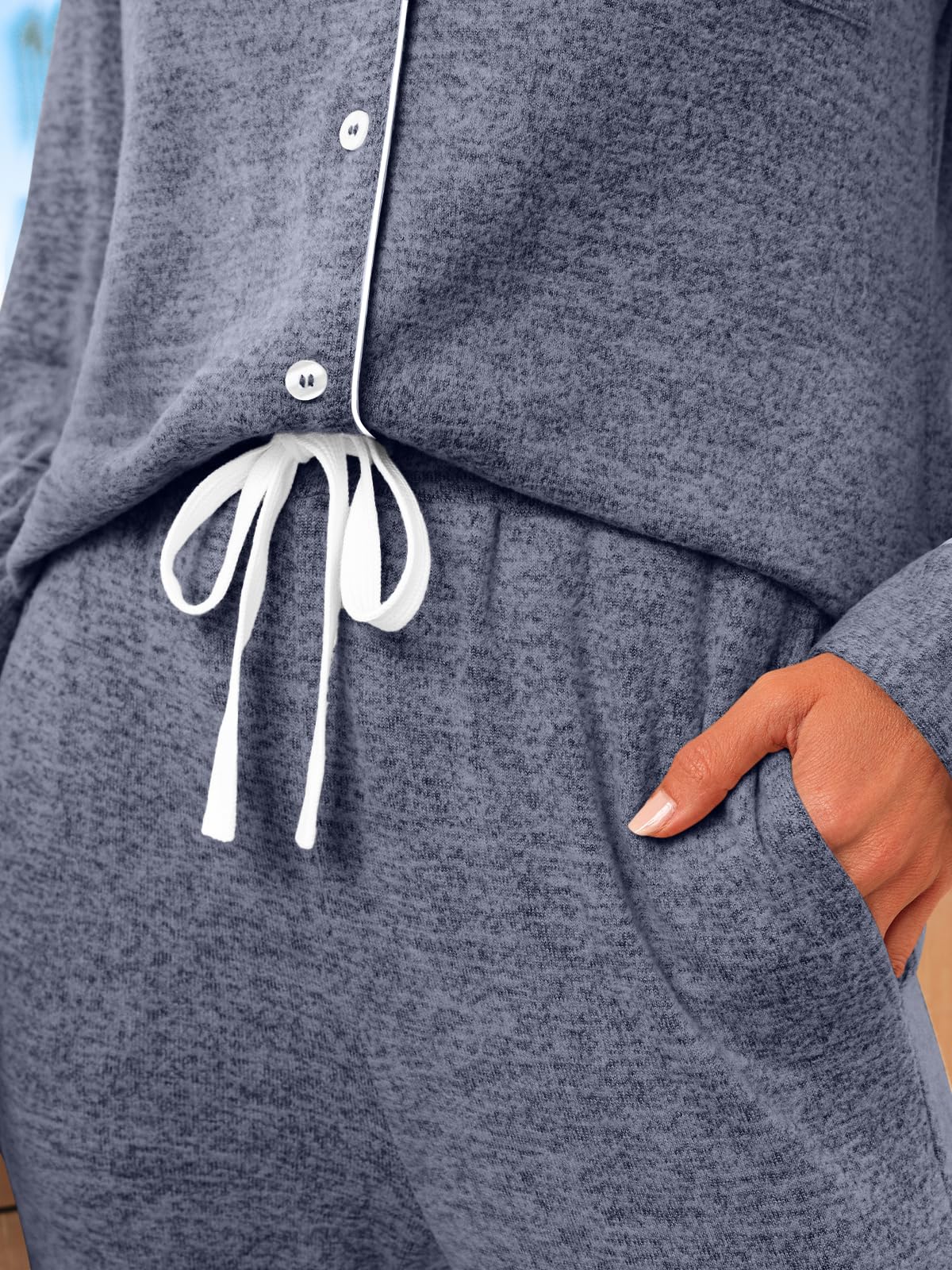 Fashion Design: Womens casual long sleeve v neck button down pajamas sets, pants with drawstring elastic design