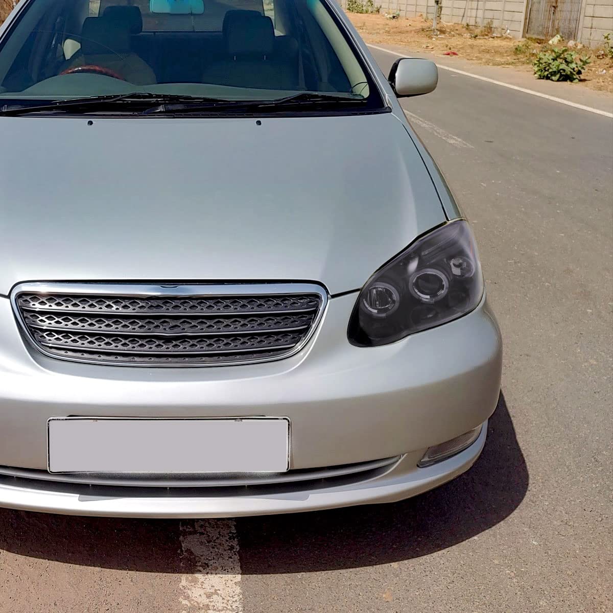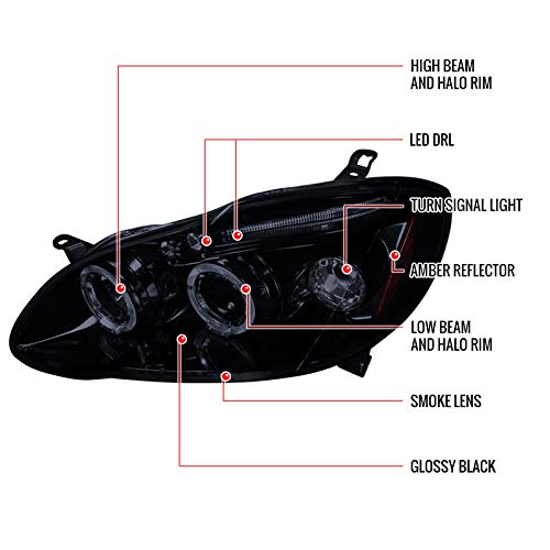 Fitment: Compatible with 2003-2008 COROLLA MODELS ONLY Color & Material: GLOSSY BLACK HOUSING SMOKE LENS Feature: JDM STYLE OE REPLACEMENT Specification: 1 PAIR OF DUAL HALO PROJECTOR HEAD LIGHTS WITH LED DRL • The item is 100% brand new in original box. • Comes with 1 pair of glossy black housing smoke lens dual halo projector head lights with bright white LED DRL (Daytime Running Lights). • H1 hi beam / H1 low beam bulbs are included. • Corner signal light bulbs are not included. Please apply stock bulbs for installation. • Professional installation is highly recommended.