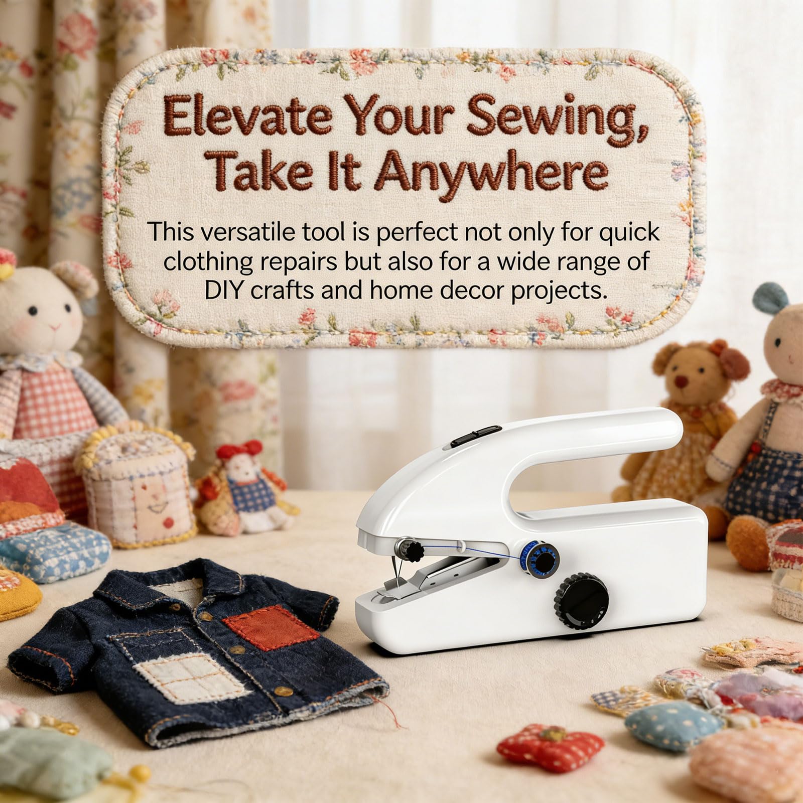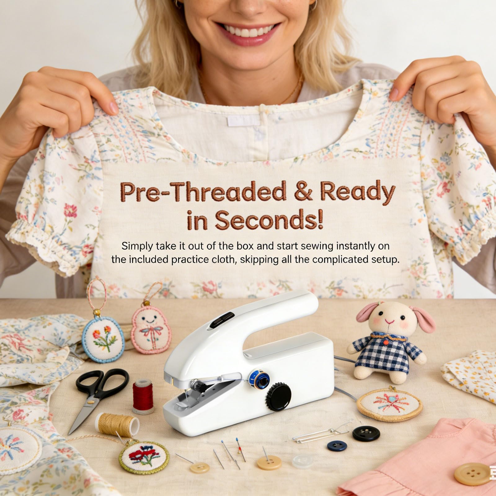 Beginner-friendly, ready to use right out of the box One-button start with no complicated setup—seniors and children can master it in 3 minutes. Pre-threaded at the factory with practice fabric included, simply insert batteries or plug it in to start sewing immediately, completely eliminating traditional threading hassles.