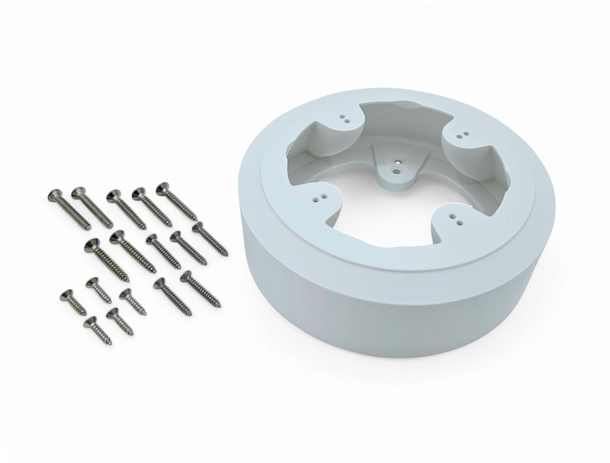 This is a heavy duty extension/enclosure/box/mount for the Ubiquiti Unifi Turret AI, G5 Turret Ultra, and G6 Turret cameras. The plastic enclosure attaches directly to the Turret base plate using small screws (included). This is a great way to extend the camera from your mounting surface in special cases. A classic example is mounting the camera under your soffit and a trim board or gutter is in the way. The other advantage to this enclosure is that it can completely contain the ethernet cable from the camera as well as the weather-sealed ethernet connector (except the 0.75" height which WILL NOT contain the weather-sealed ethernet connector). In many applications, it is not possible or desirable to drill a large hole to pass this connector through, so this enclosure lets you contain everything right behind the camera, and it is sleeker than a large junction box. Especially if you are replacing an older Bullet camera with a Turret where you already have an existing cable protruding from the wall or ceiling, you won't want to have to try drilling out a bigger hole for the new connector. The outer diameter of this enclosure is 118mm (4.65 inches) and we make them in several heights. These tubes can be stacked to add length, and they will also attach directly to a single gang electrical box or a round box with 2.75" hole spacing (screws included). The shortest variant is just 1.5" tall and the weatherproof connector can still be completely contained within the enclosure, but if you are working with thick outdoor/shielded ethernet cable, it may be difficult to get it to bend tightly enough to fit, so one of the larger enclosures may be preferred (but the short one will definitely work). Stainless steel screws are included with each camera mount/enclosure to attach the camera to the enclosure and attach the enclosure to your surface. If you are attaching to drywall or masonry then you will need to supply plastic wall anchors (readily and cheaply available at any hardware store). These are 3D printed ASA parts which we make in-house (so you can expect some small aesthetic imperfections). ASA is an outdoor plastic with excellent weather and UV resistance (unlike many other plastics being used for 3D printing). ASA also accepts paint nicely, which will be useful if you plan to paint these to match your house colors. We suggest using a primer before painting.