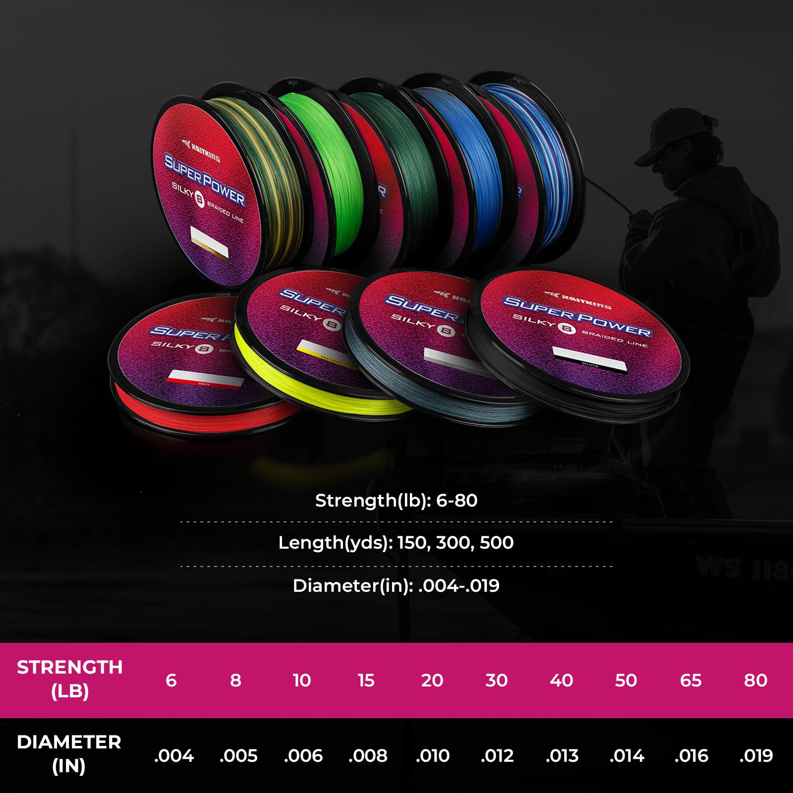 Wide Assortment Of Colors and Strengths – SuperPower Silky8 braided fishing line is available in 9 colors (Moss Green, Gray, Grass Green, Yellow, Blue, Red, White, Blue Camo and Camo) so you are always using a color that matches your fishing conditions. It is available in 150-yard, 300-yard and 500-yard spools from 6 lbs. to 80 lbs. breaking strength.