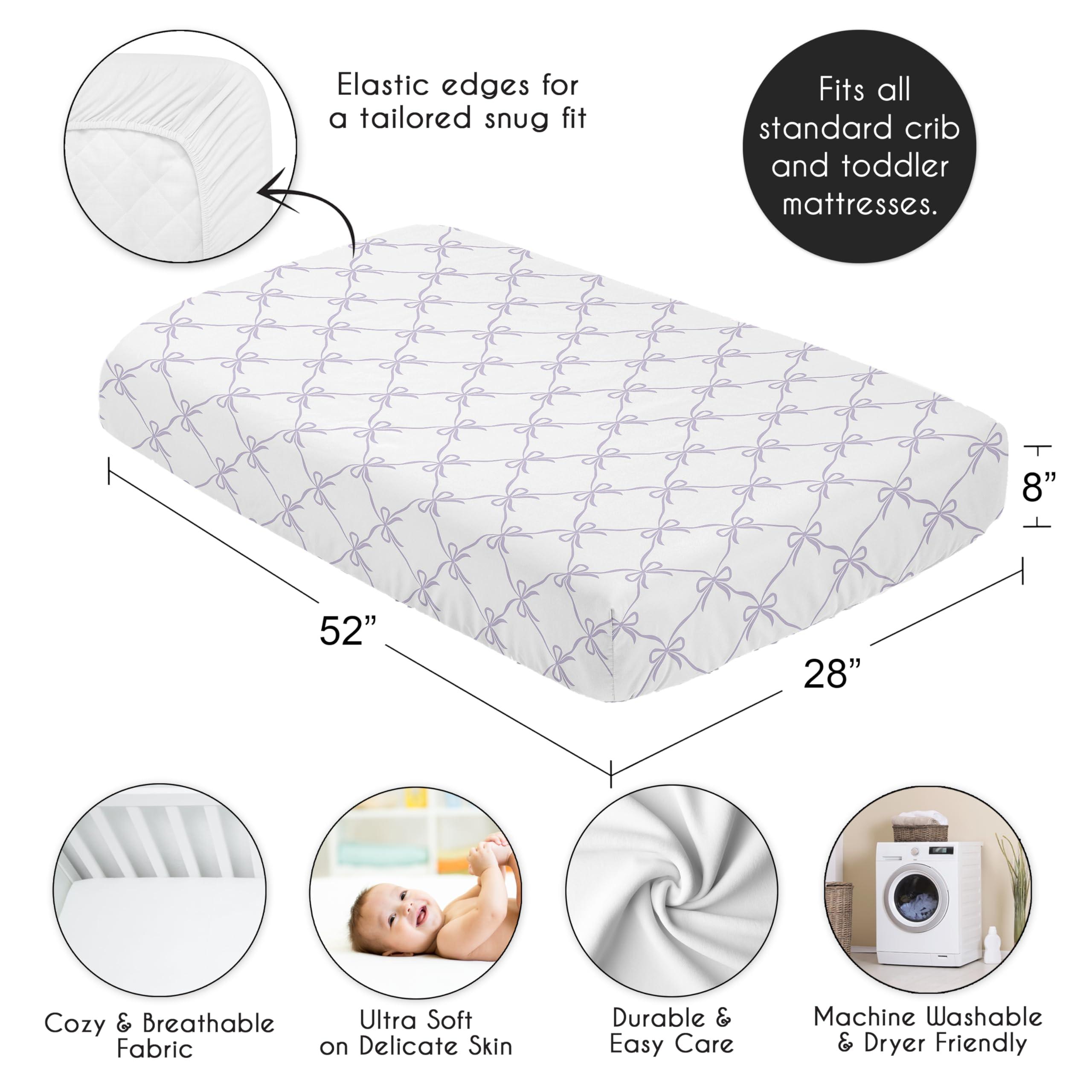 SNUG FIT: Includes (1) Fitted Crib Sheet 52in. x 28in. x 8in. Our newborn standard crib sheets fit snugly, with premium elastic sewn around the entire bottom edge for a secure fit on most standard sized cribs and toddler beds, to reduce shifting & bunching. This brushed microfiber crib sheet features an exclusive design of white & lavender purple, lilac, violet bows for the shabby chic, Princess Ballerina and Ballet Collection & is gentle on delicate skin to foster a soothing sleep environment.