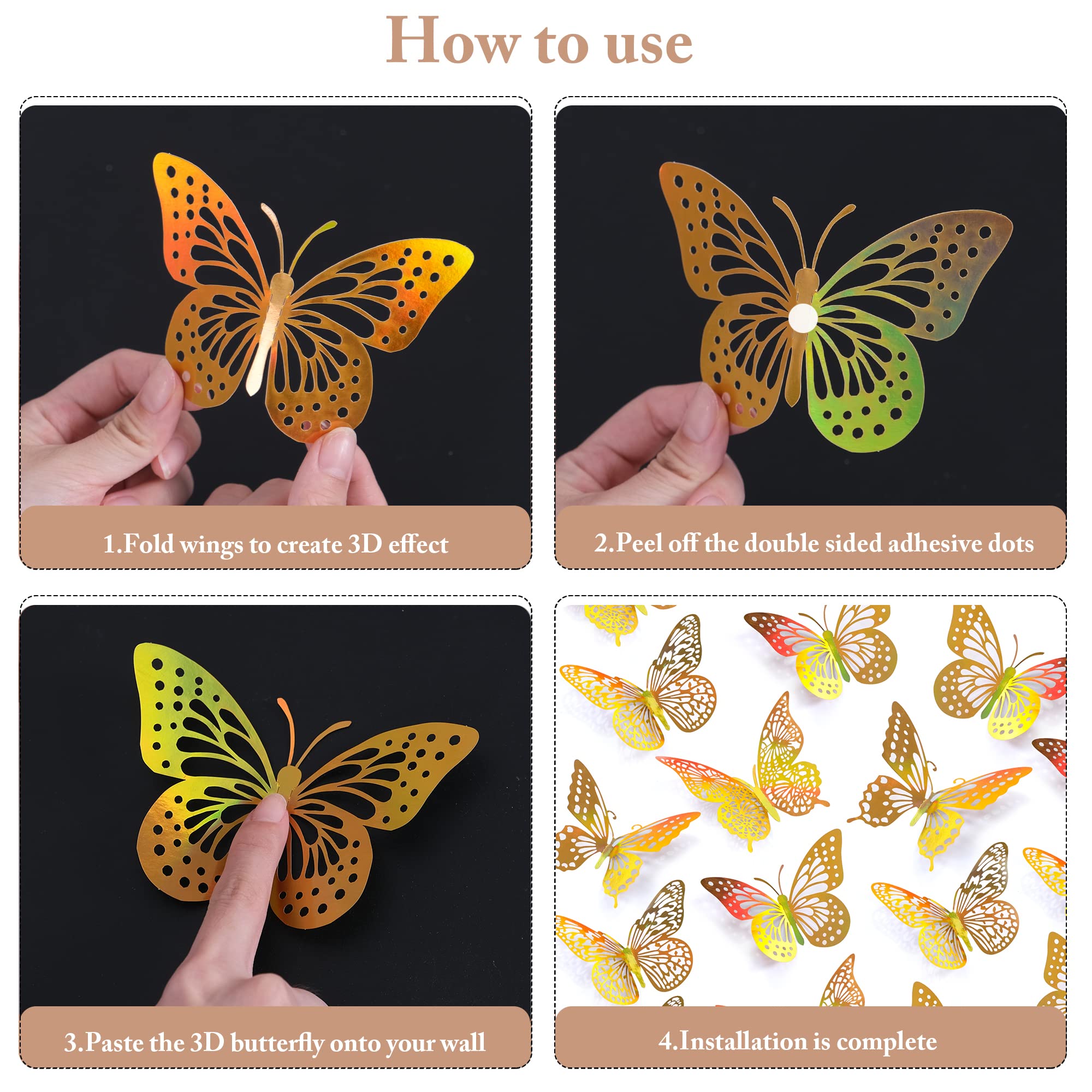 【Package Included】48 pcs butterflies: 12 pcs Style 1, 12 pcs Style 2, 12 pcs Style 3, 12 pcs Style 4, each style has 3 sizes(3", 4", 5"). Coming with 48 pcs double sided adhesive dots.