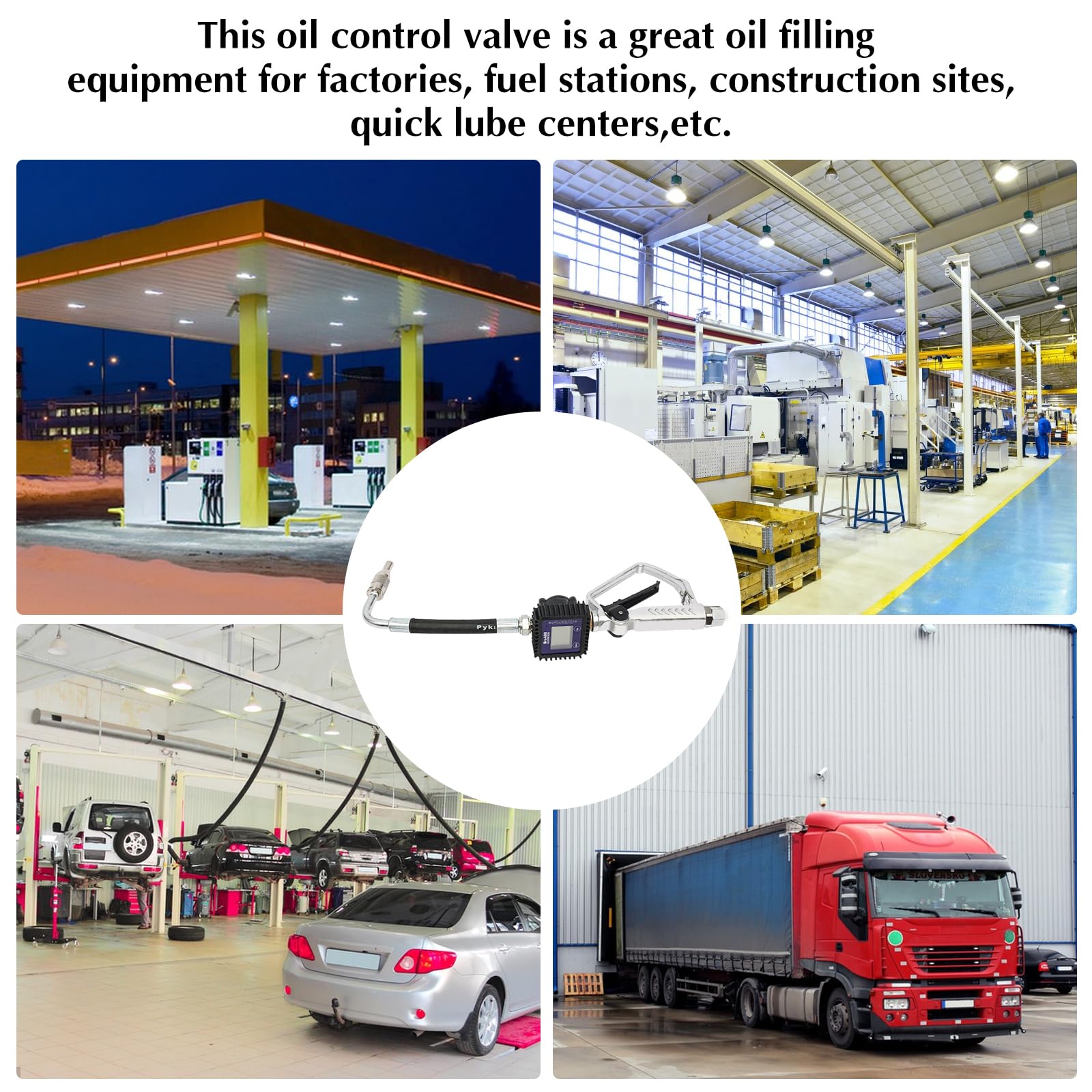 [Widely Used] Digital oil pump equiped 5-digit liquid crystal display for both volume each time and total; 4 units: L, GAL, PT, and QT; 4 buttons: "move", "reset" (front of the meter), "1" and "2" (back of the meter). Used for filling fluid such as gear oil, engine oil, antifreeze, it is a great oil filling equipment for factories, gas stations, etc.
