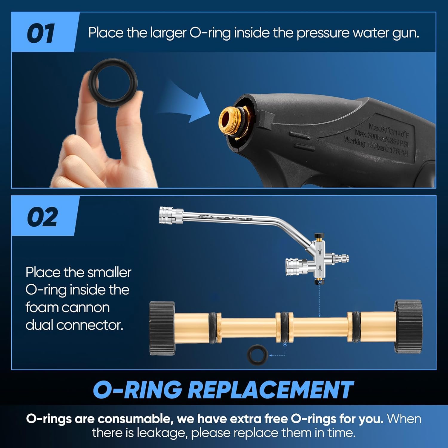 ✨【⭕NOTE】O-rings are consumable, we have extra free O-rings for you. When there is leakage, please replace them in time.For details, please refer to the product image.The maximum allowable water pressure for Saker foam cannon is 4000 PSI. Exceeding this limit may cause damage.
