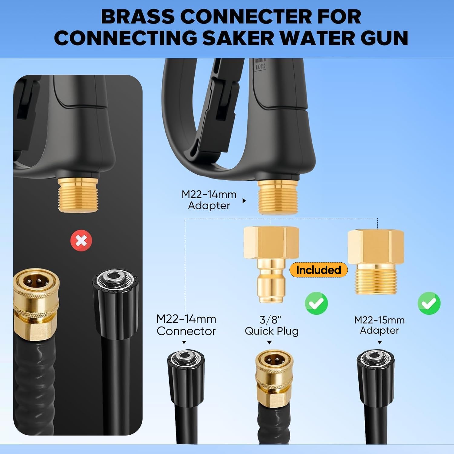 ✨【⭕NOTE】DOES NOT FIT GARDEN HOSES AND FAUCETS and must be used with a pressure washer !!!⭕BEFORE USE, PLEASE MAKE SURE THAT THE BLACK NUT ON THE FOAM CANNON DUAL CONNECTOR HAS BEEN TIGHTENED. ⭕The connection port of our Saker high-pressure water gun is 14mm. So if your water pipe has a 15mm or 3/8-inch connection port, you can use Saker connectors of the corresponding size.Package provides the 1x 3/8"quick plug adapter to adapt to the 3/8"quick connector and 1x M22-15mm adapter.